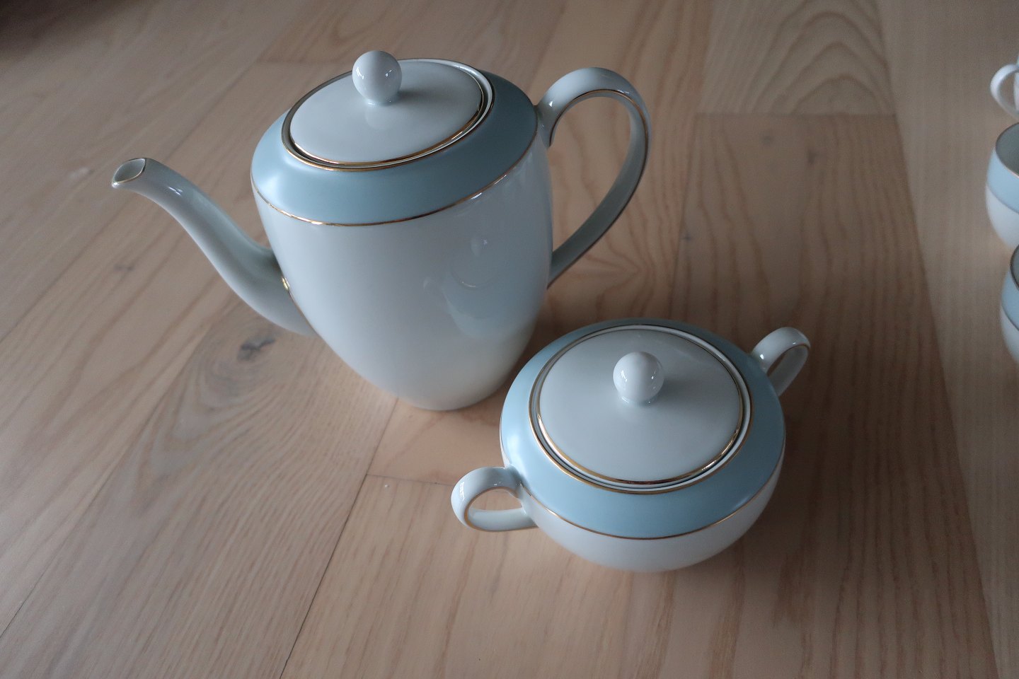 Rare coffee service from Arzberg (Germany), in total 52 itemsA good and light service: White with a wide light blue rim and 2 golden stribs