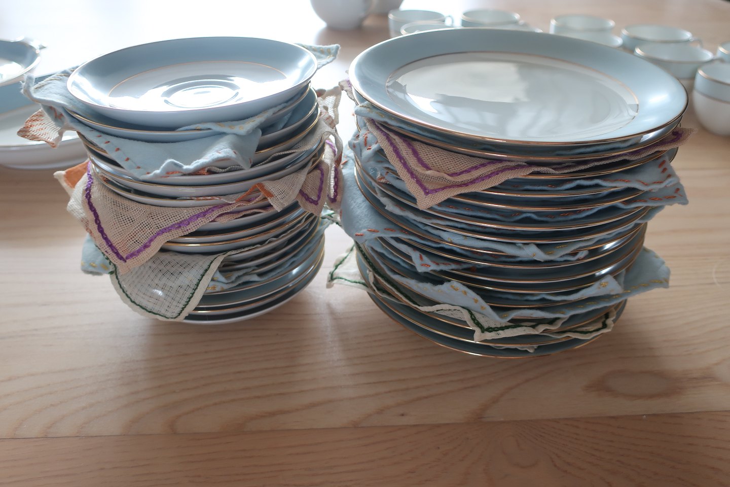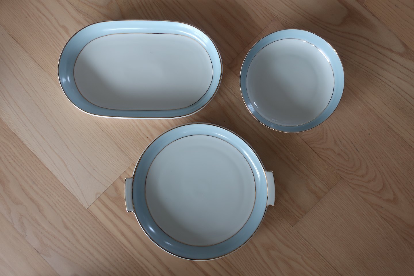 A good and light service: White with a wide light blue rim and 2 golden stribs