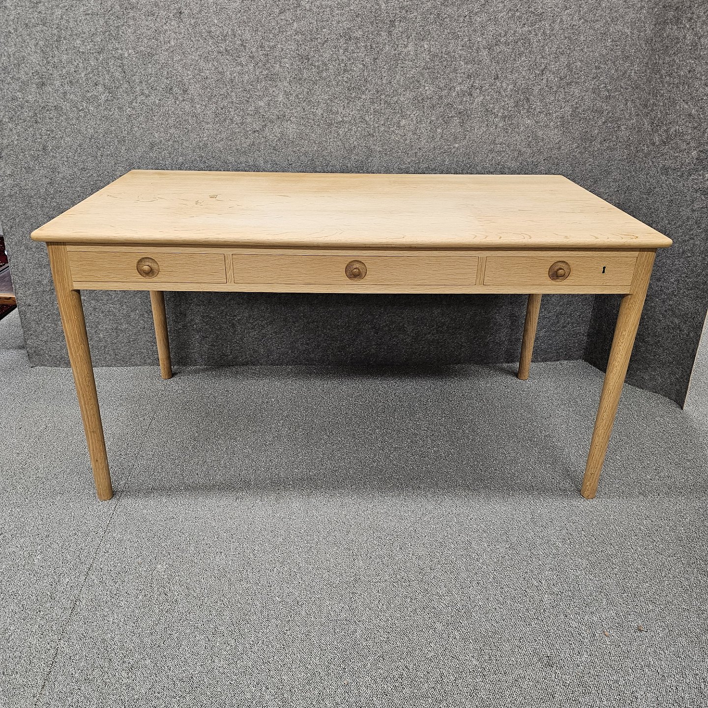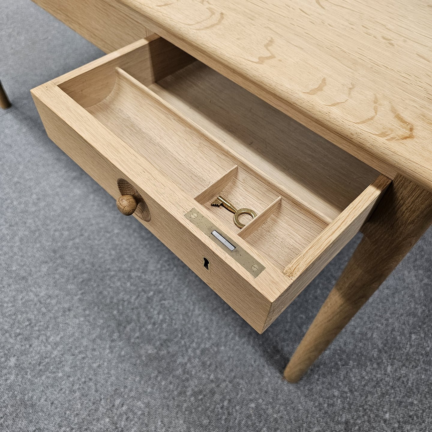 Fritstående skrivebord i egetræ med tre skuffer, højre skuffe har lås og medfølgende nøgleModel 305