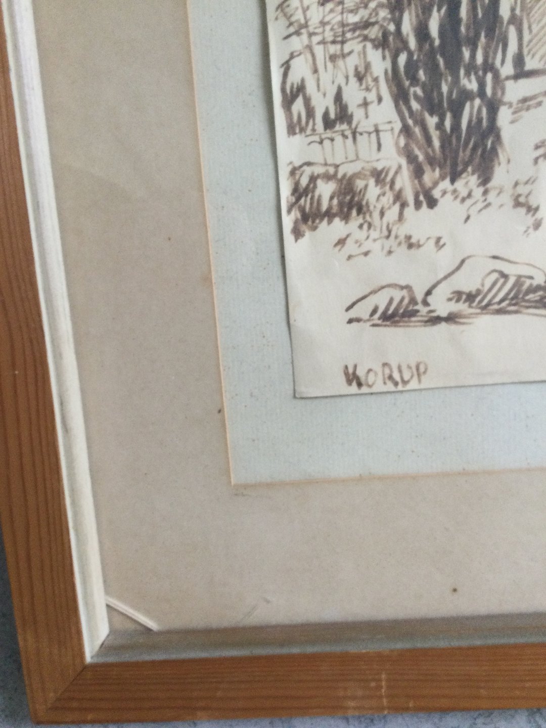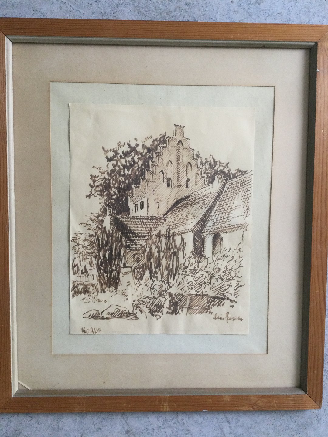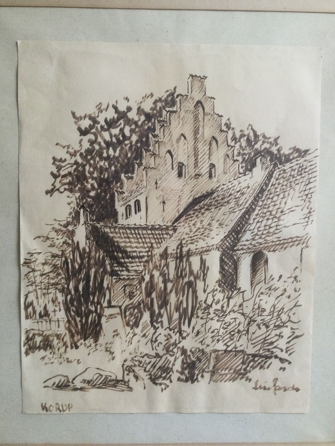Tegning af Lise Færch - Parti fra Korup Kirke ved Odense.