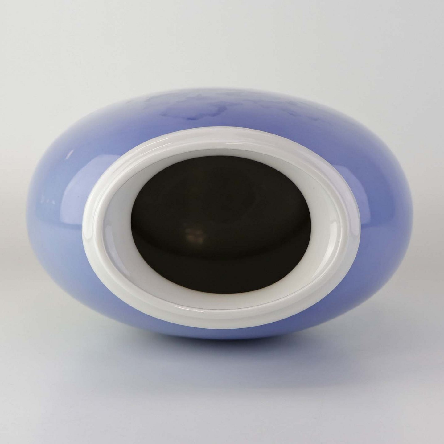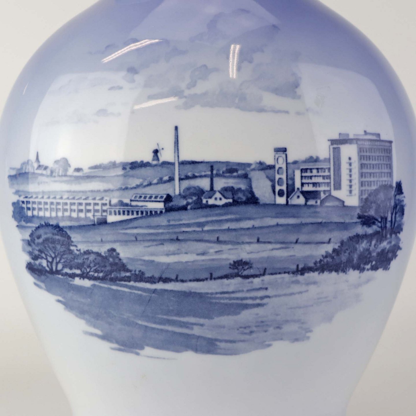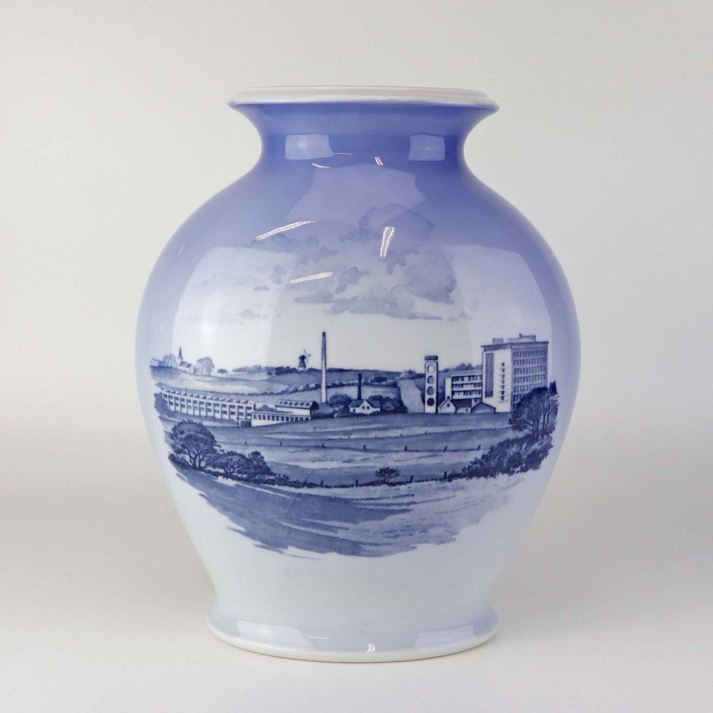 Oval jubilæumsvase i kongelig porcelæn med motiv af Danfoss fabriksbygninger. Nr. 3088Producent Royal Copenhagen