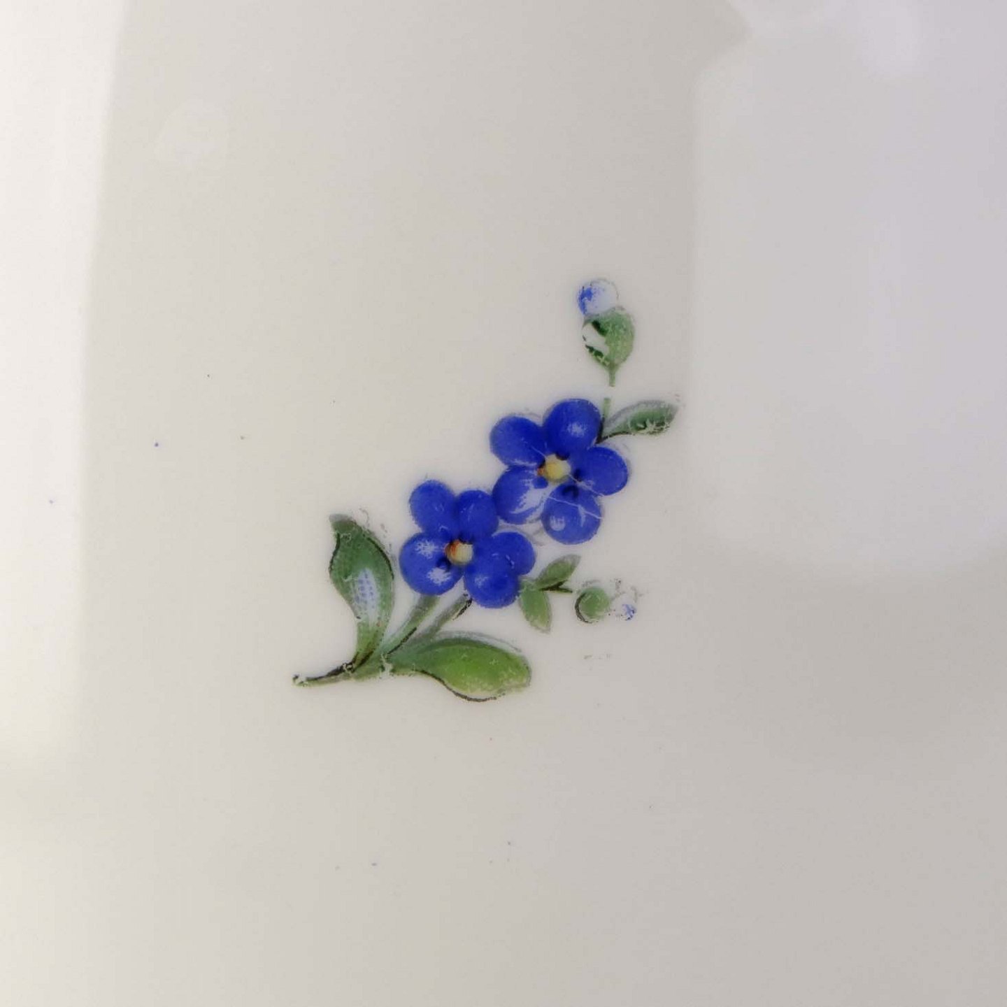 Service i cremefarvet porcelæn med skelform dekoreret med forskellige flerefarvede blomster og guldkant.