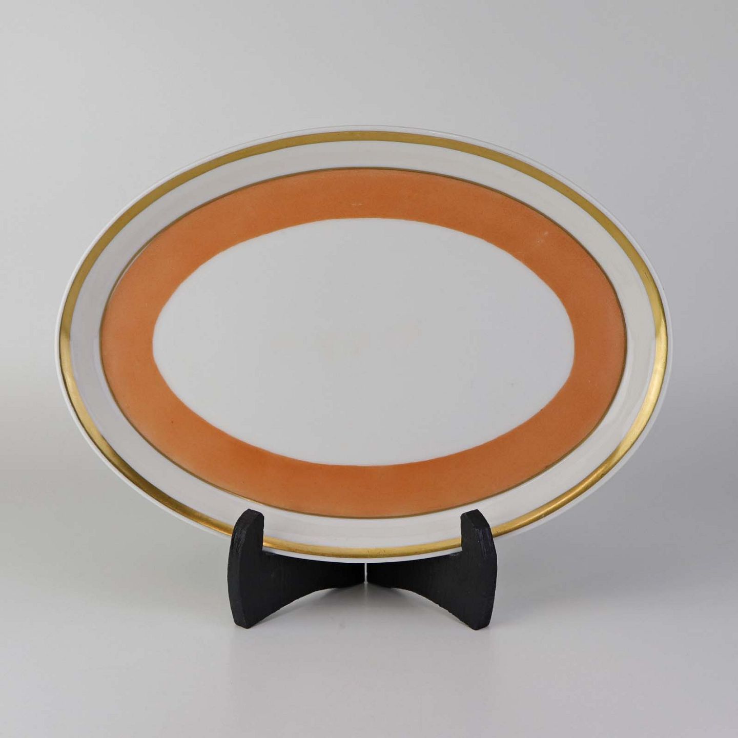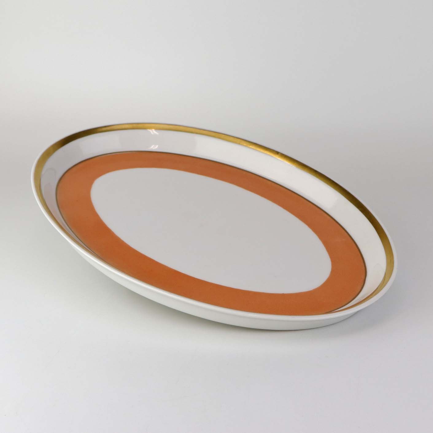 Service i glat hvidt porcelæn med orangerød dekoration over glasuren og guldkant