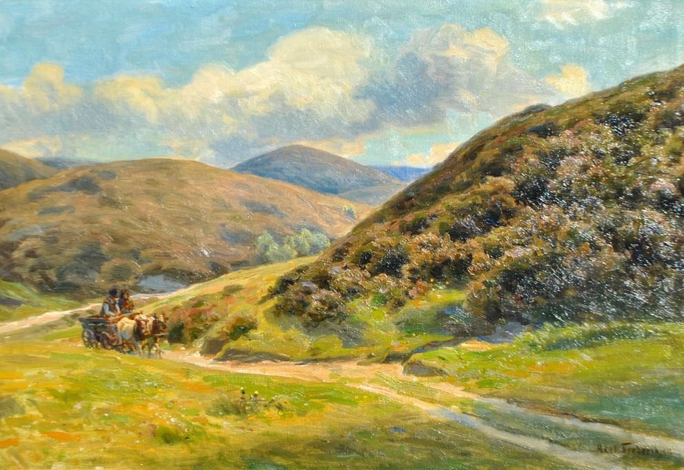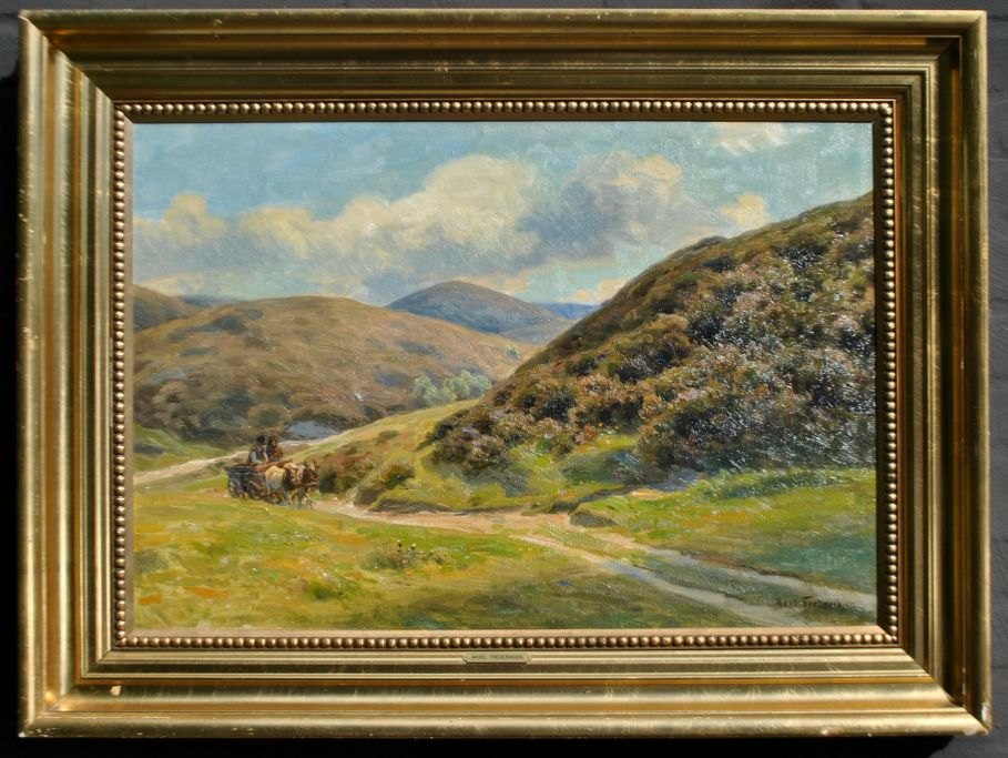 Frederiksen, Axel (1881 - 1961) Denmark: An ox-drawn cart in Rebild Bakker. Oil on canvas. Signed. 50 x 70 cm.Framed: 65 x 88 cm.