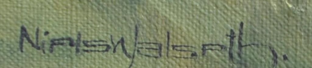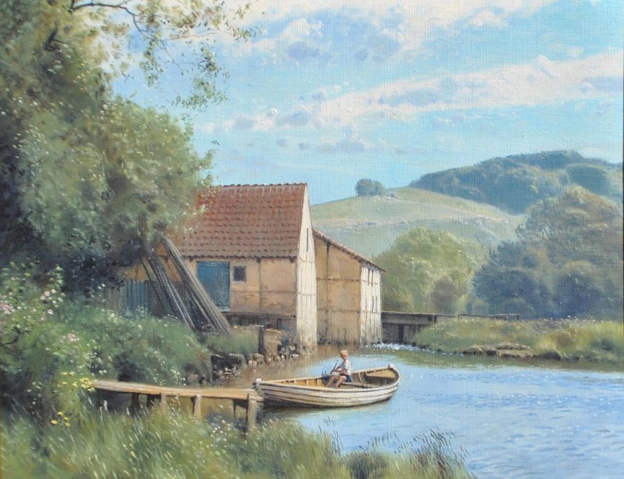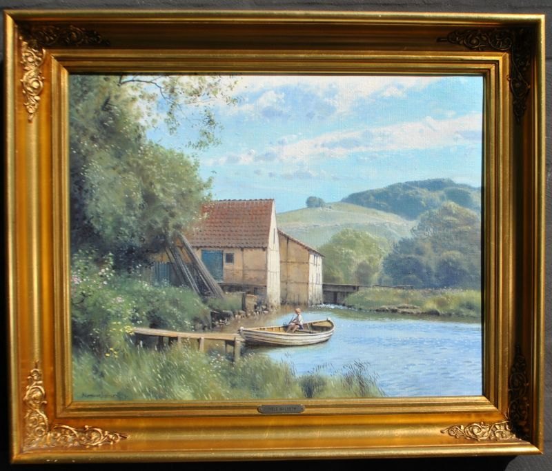 Walseth, Niels (1914 - 2001) Denmark: A boy in a rowboat on a mill lake. Oil on canvas. Signed. 40 x 50 cm.Framed in a corner ornamented gilded frame: 50 x 60 cm.