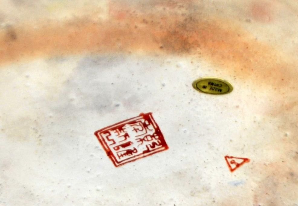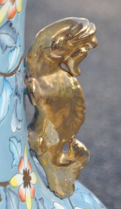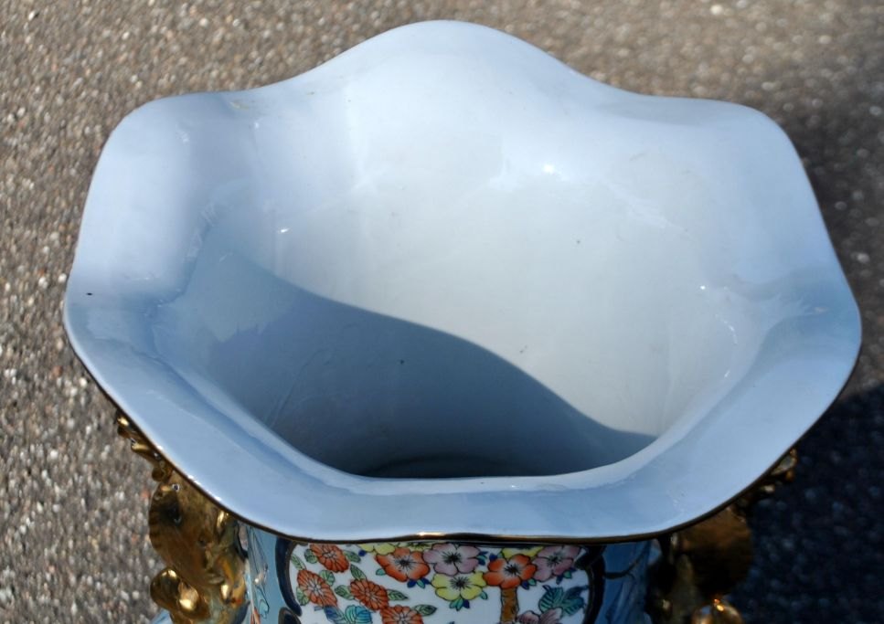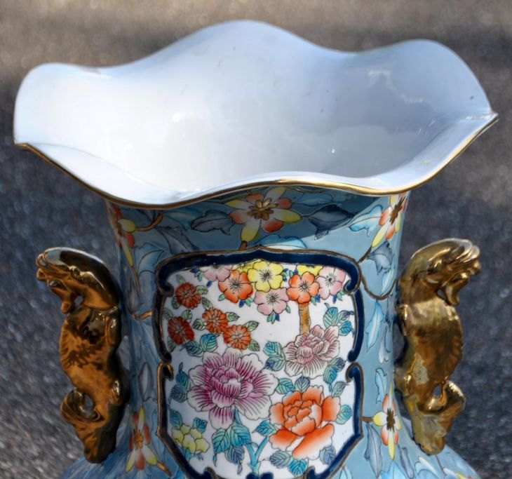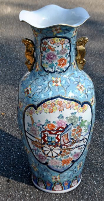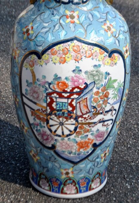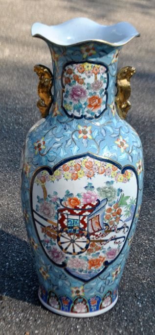 Stor kinesisk gulv prydvase i porcelæn, 20. årh. Talrige polykrome dekorationer i form af vogne med blomster, fugle i blomsterbuske m.v. Forgyldte hanke. Flæset kant. Stemplet. H.: 81,5 cm.Emne nummer: 28226