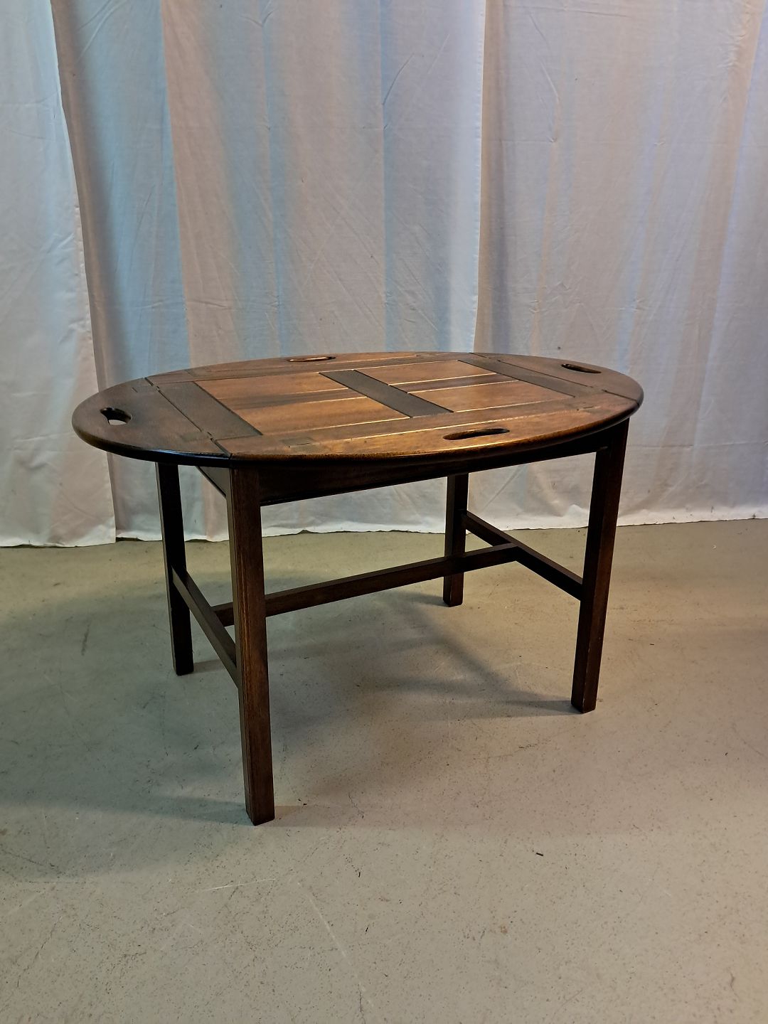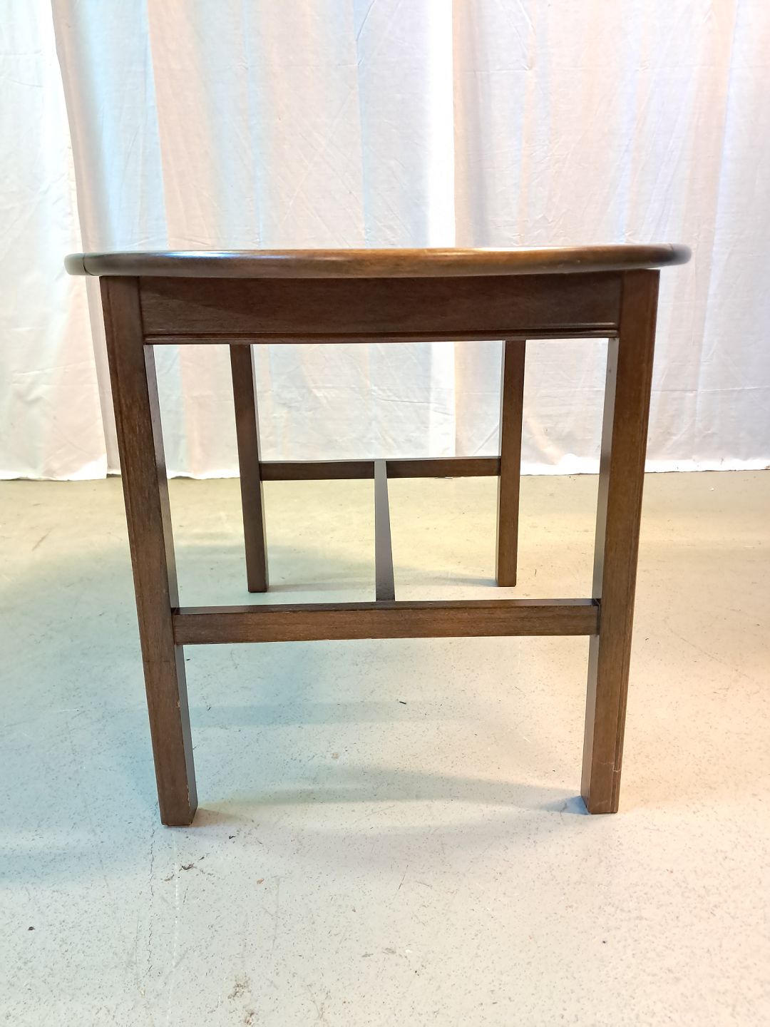Sofabord i fineret mahogni, fra 1980erne.Det har brugsspor.