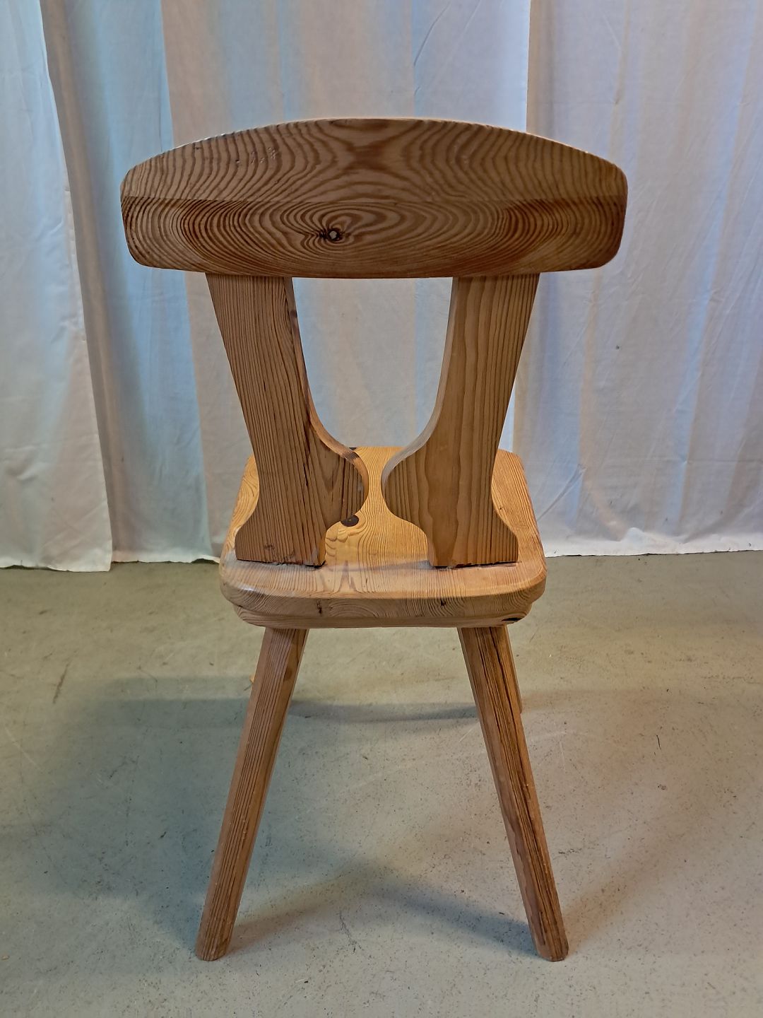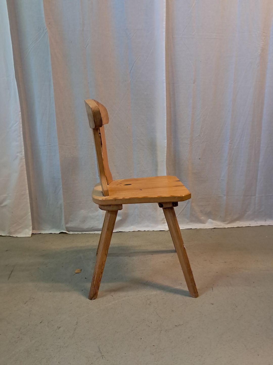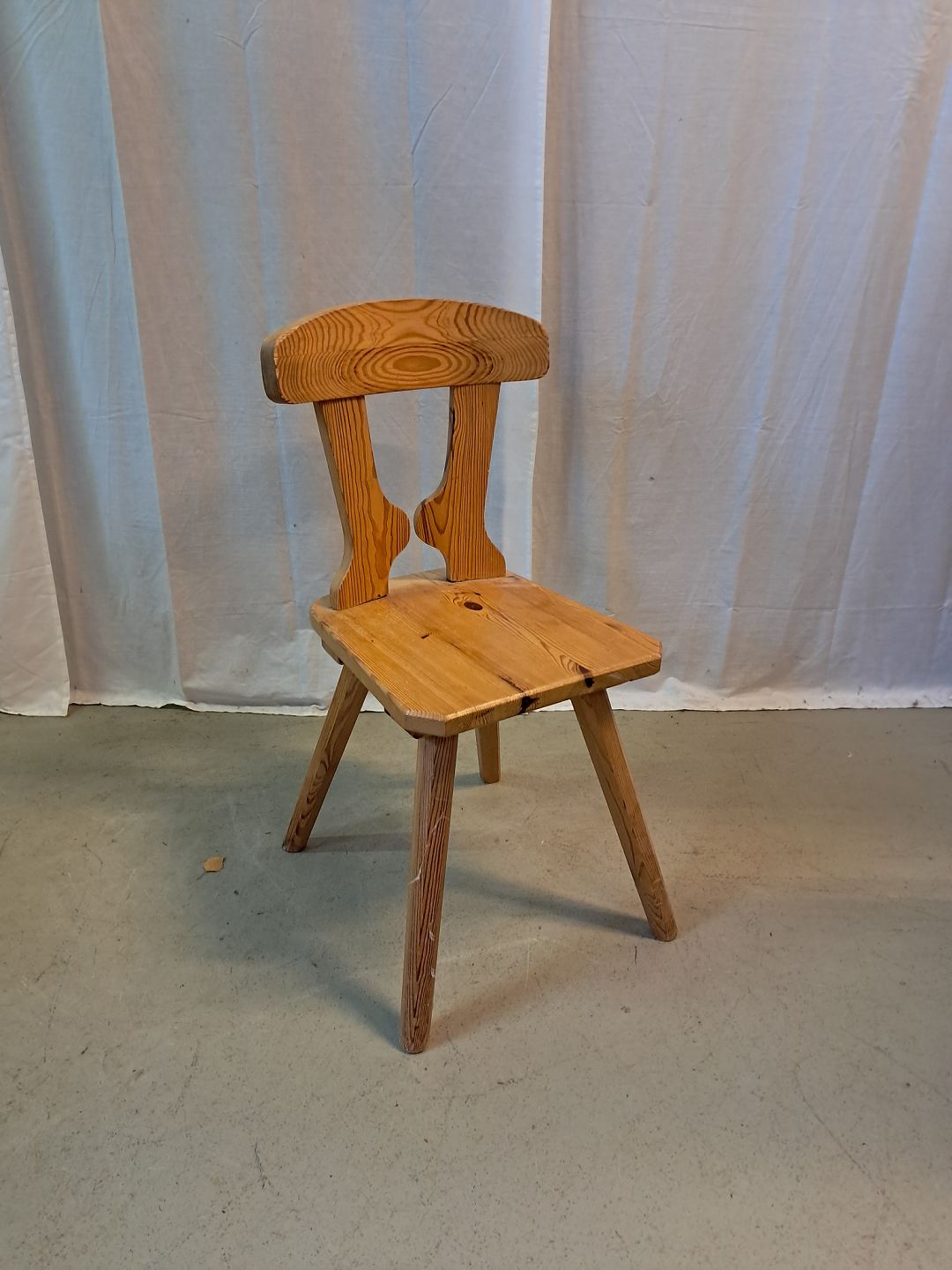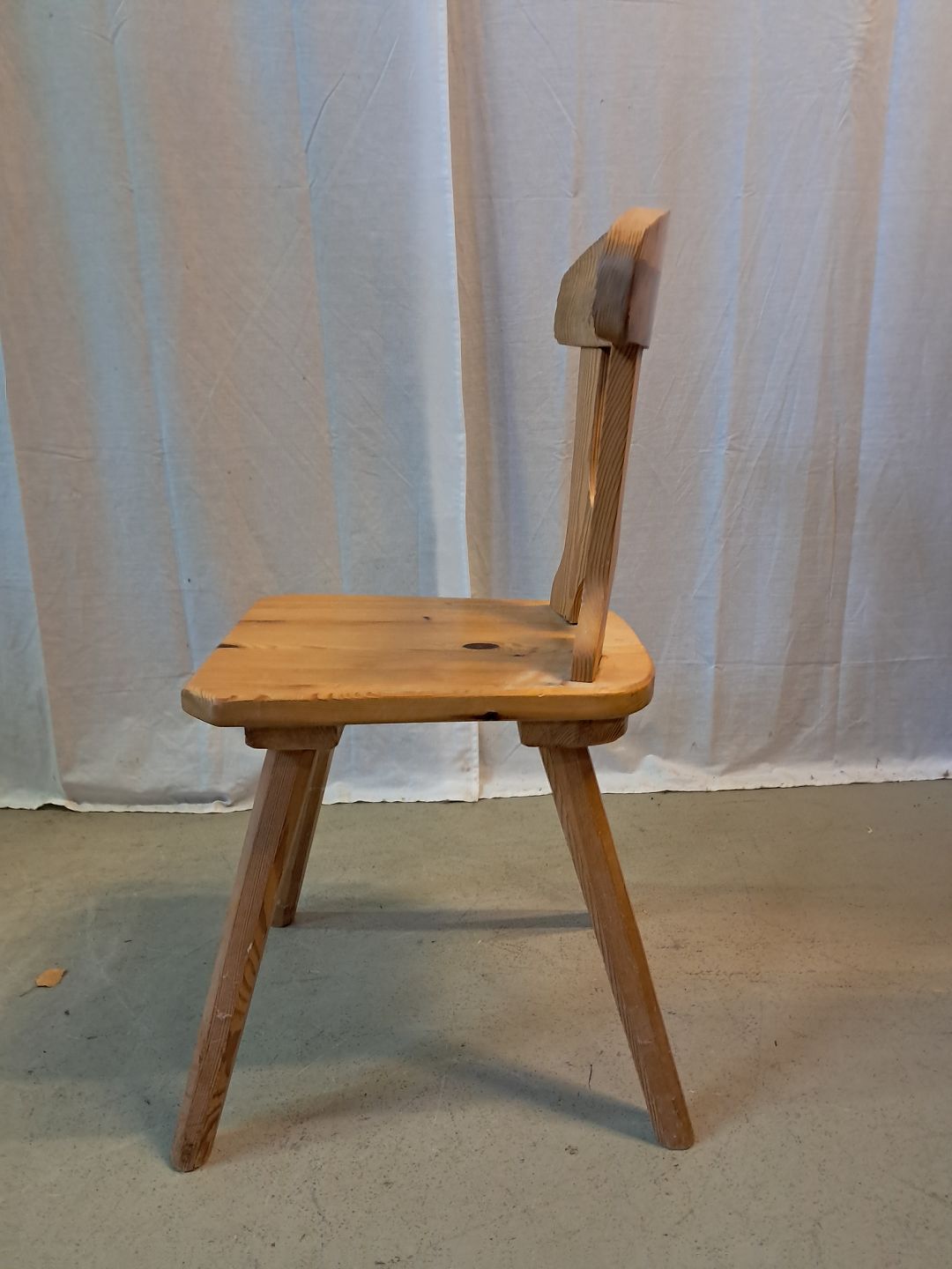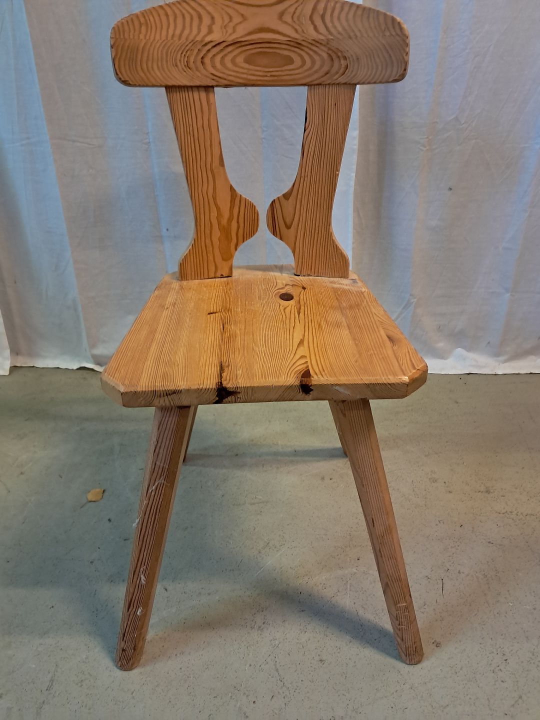 Stol i massivt fyrretræ, fra 1980erne.Den har brugsspor.