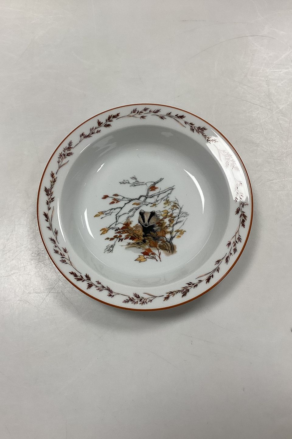 Mads Stage Hunting Dinnerware Deep Plate. Manufacturer: Seltmann Weiden. Motif: Badger.Measures 20.5 cm / 8.07 in.