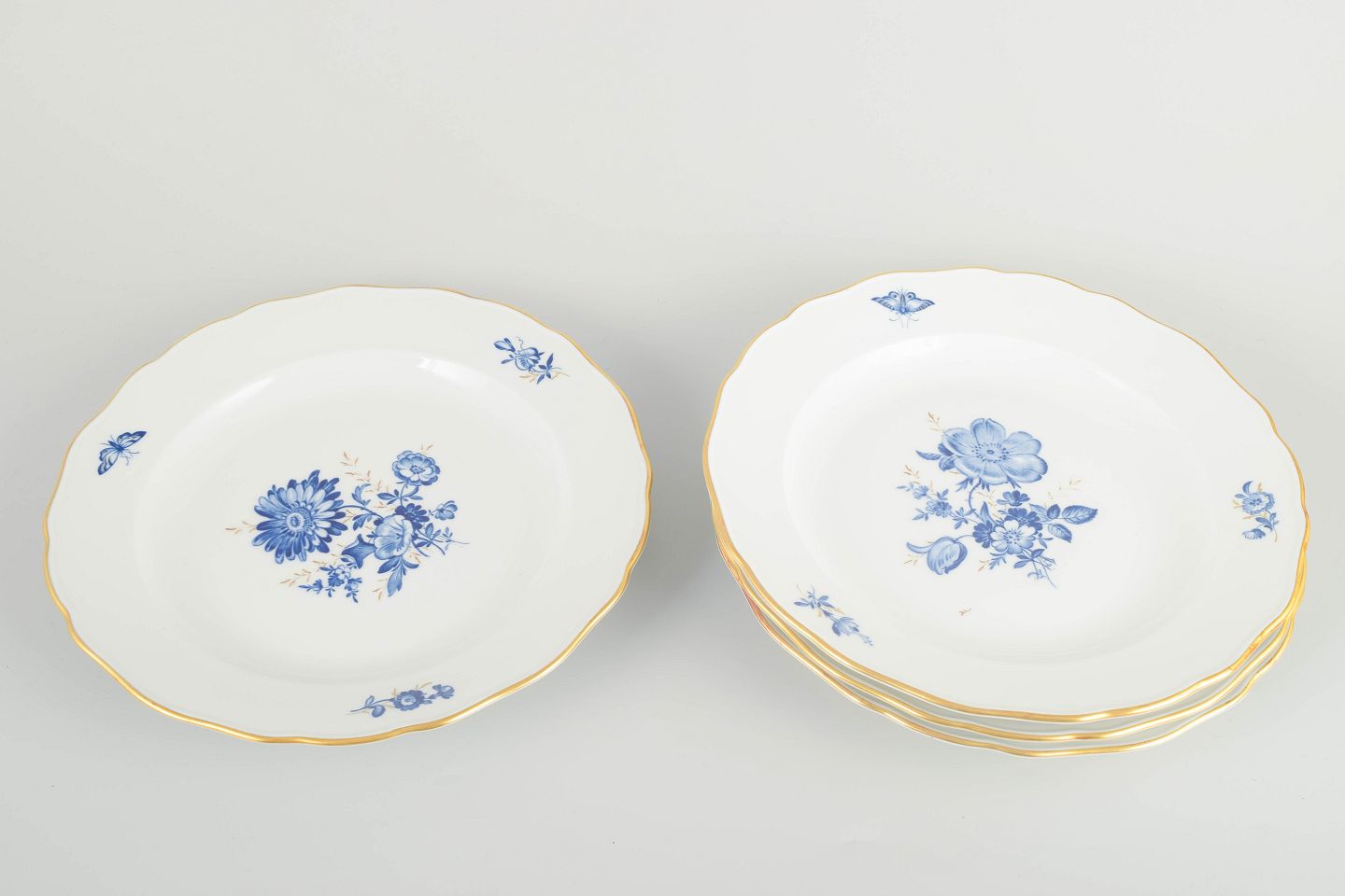 Hand-decorated porcelain with hand-painted blue floral motifs and gilt accents along the rim. Classic lightly scalloped form.