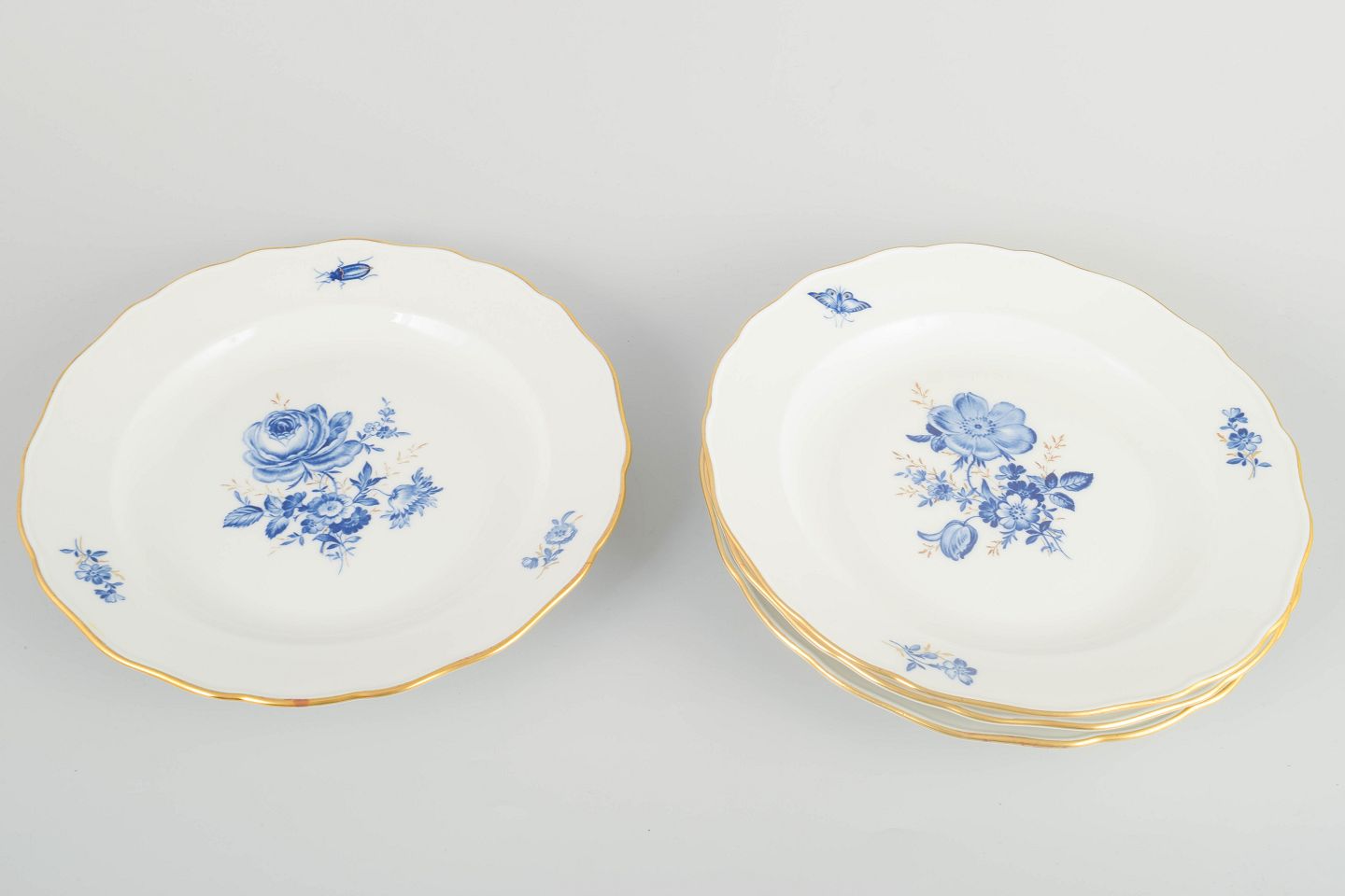 Hand-decorated porcelain with hand-painted blue floral motifs and gilt accents along the rim. Classic lightly scalloped form.