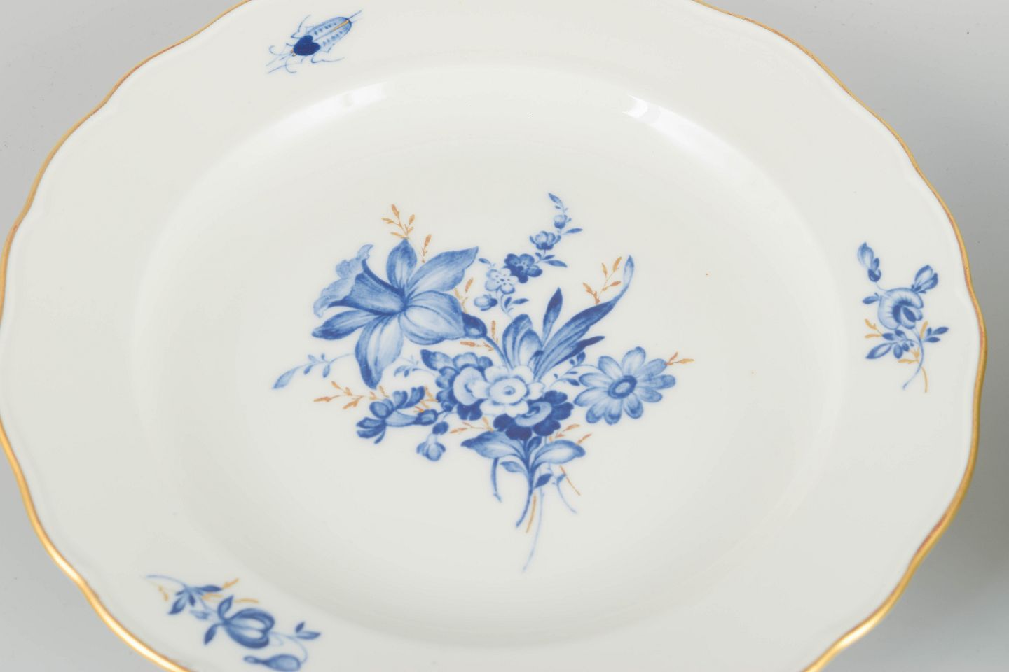Hand-decorated porcelain with hand-painted blue floral motifs and gilt accents along the rim. Classic lightly scalloped form.