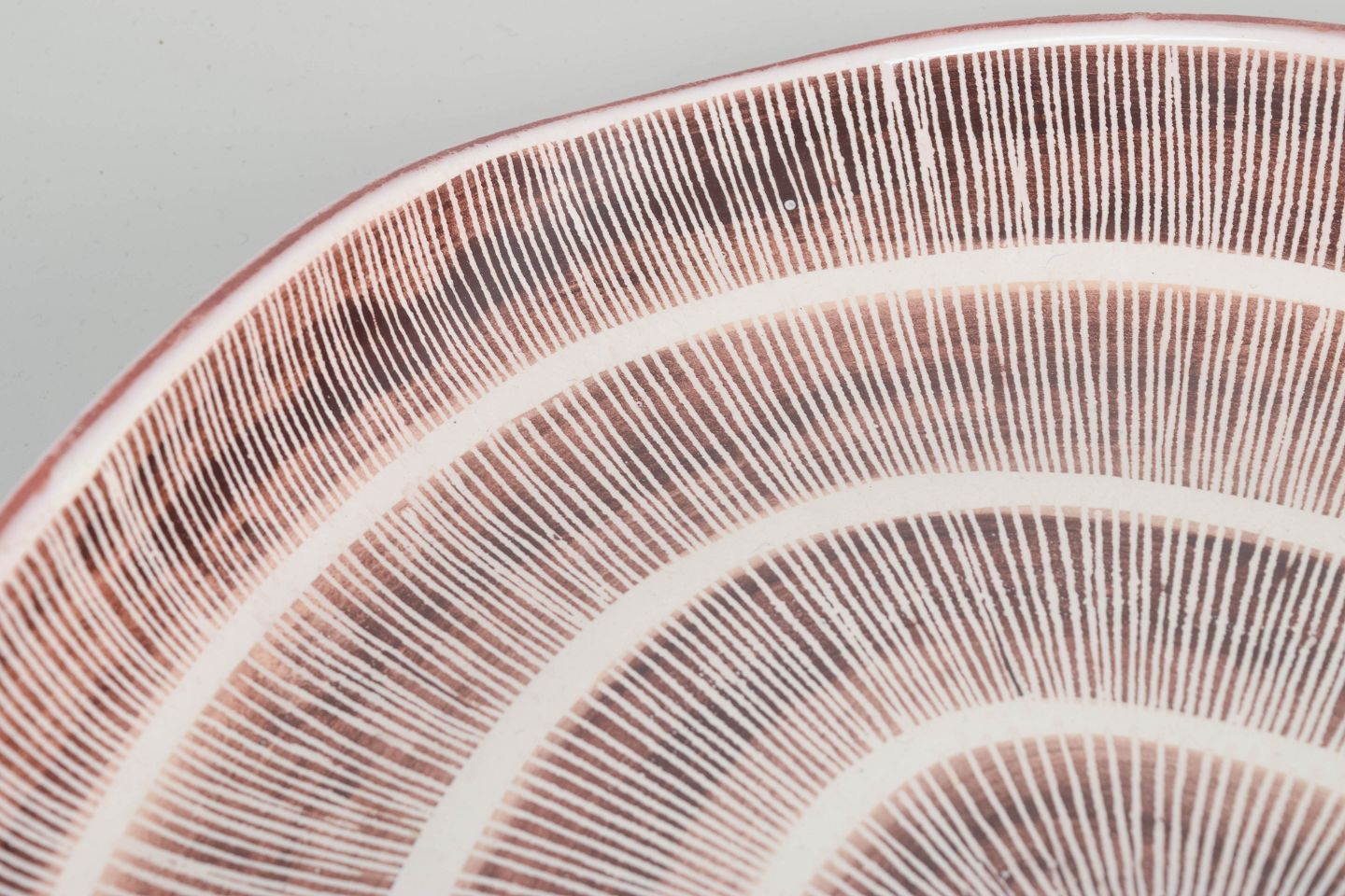Organic-shaped serving dish in glazed stoneware with graphic radial decoration in reddish and white tones.