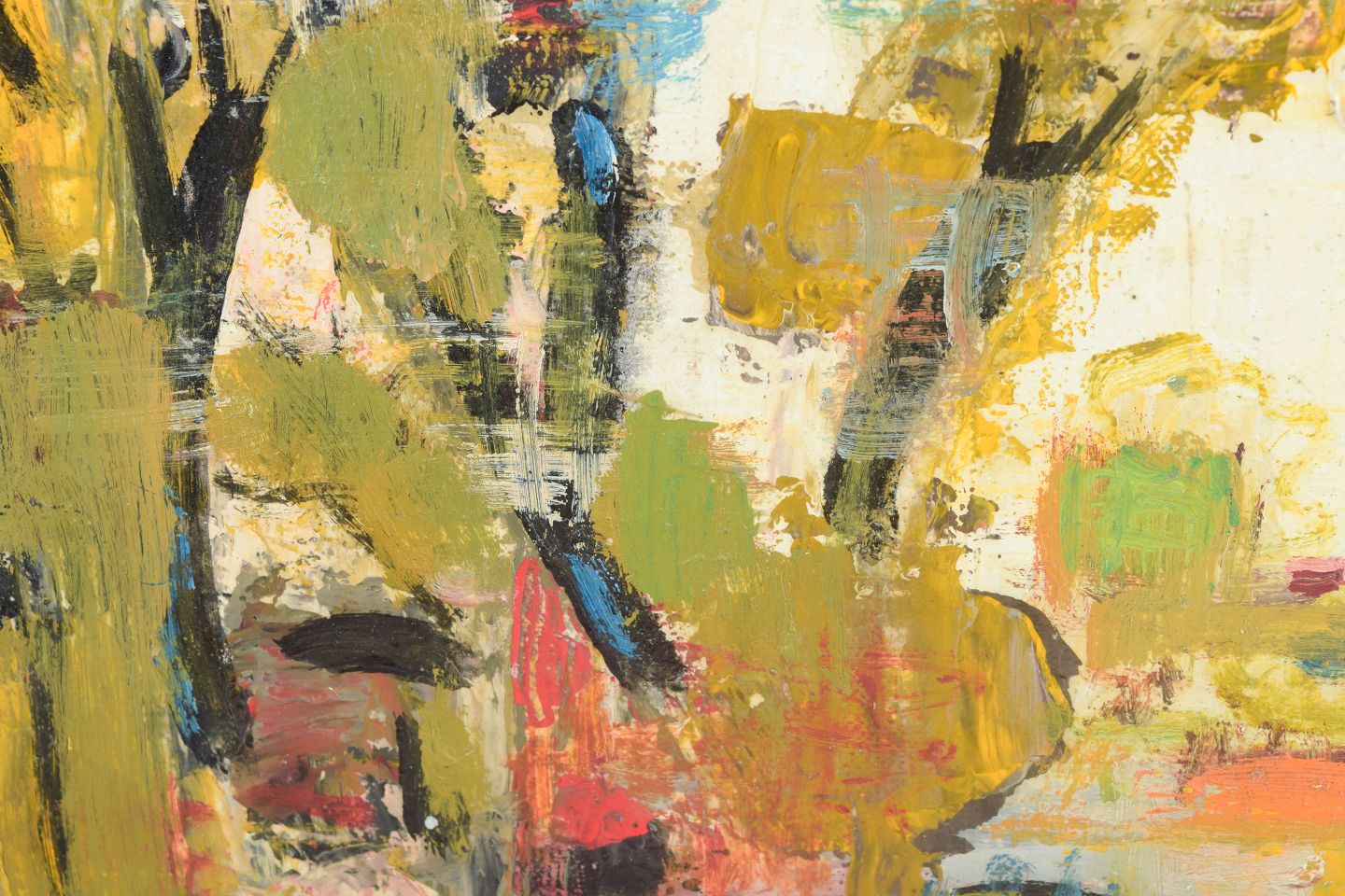 Vibrant and loosely composed landscape rendered in a warm palette of yellows, greens, and pink tones. The forms of nature dissolve into rhythmic, lyrical fields of color built with swift, expressive brushwork. A sun-soaked, atmospheric impression where mood takes precedence over detail.