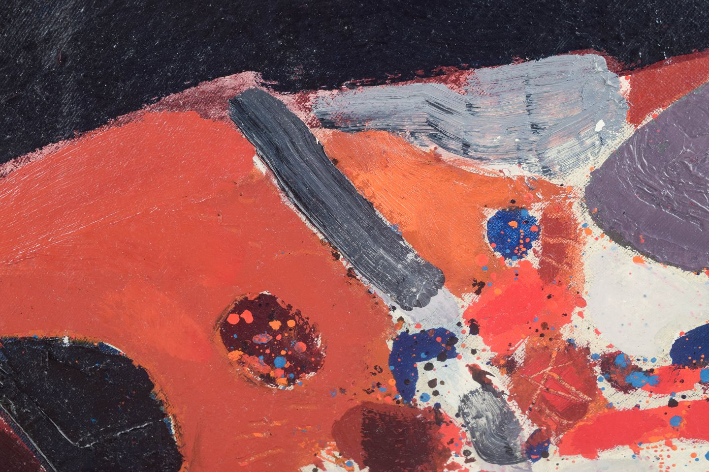 An expressive abstract work in circular format, where red, black and deep blue colour fields collide in a dramatic, almost cosmic composition. Gestural palette-knife textures evoke an intense nocturnal atmosphere — like an imagined landscape seen in darkness.