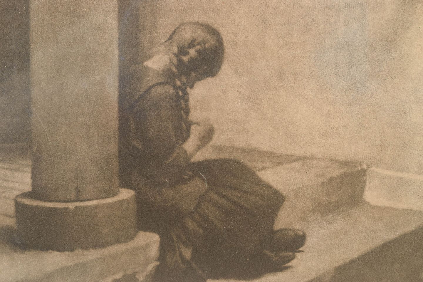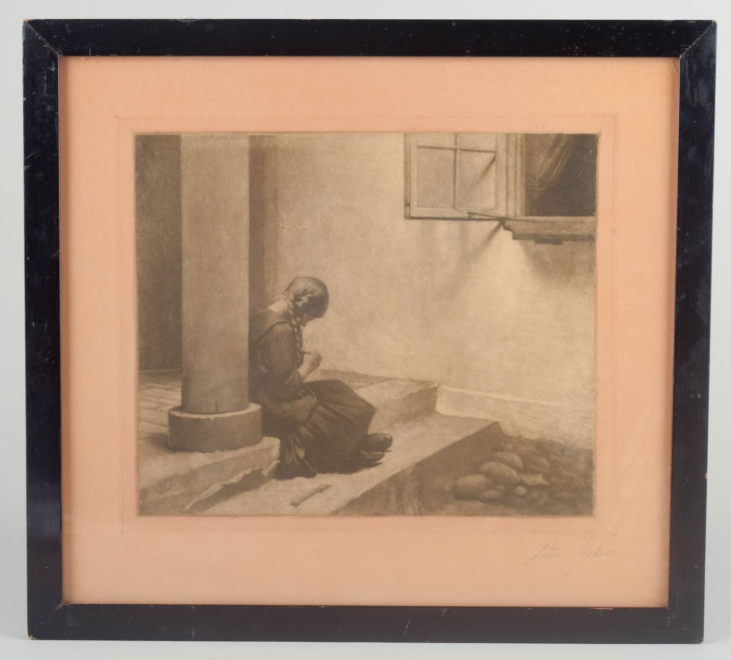 Atmospheric interior scene depicting a young girl by a column — rendered in Ilsted’s signature quiet, light-soaked tonal universe. The refined mezzotint technique produces a dreamlike play of light and shadow, emphasizing the poetic stillness for which Ilsted is renowned.