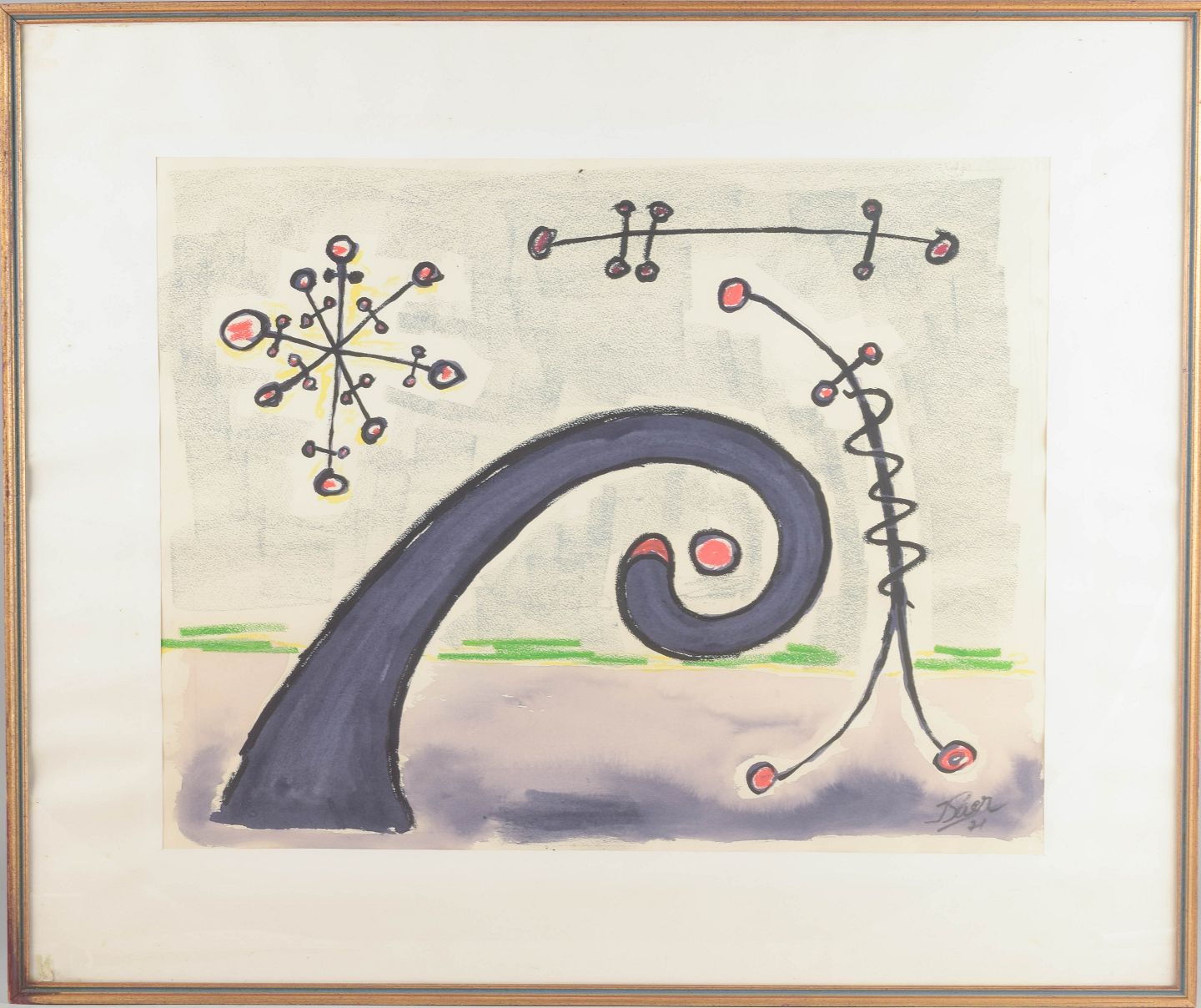 Organic–surrealist composition featuring floating molecular structures and spiral motions in a dream-like, almost cosmic space. The reddish nodes act as rhythmic accents uniting the graphic elements. Executed in light transparent watercolour, framed behind glass.