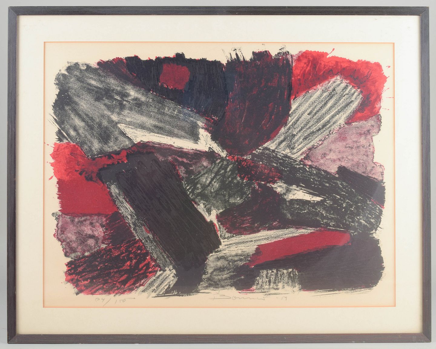 Abstract composition from 1957 with dynamic movement and contrasting color fields, characteristic of Bonnier’s experimental approach to postwar Scandinavian non-figurative art.