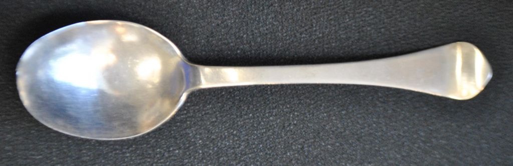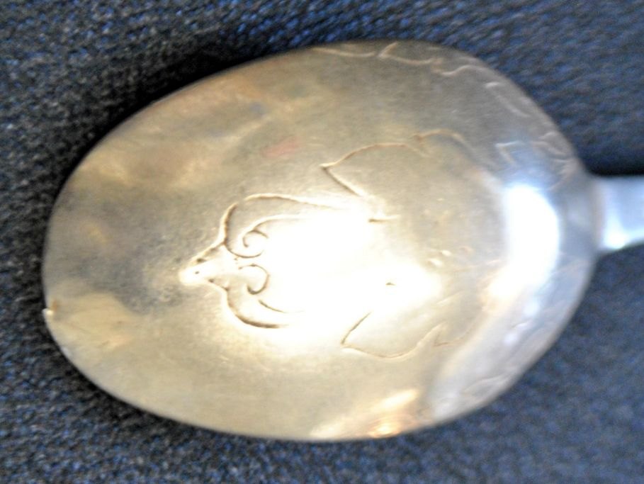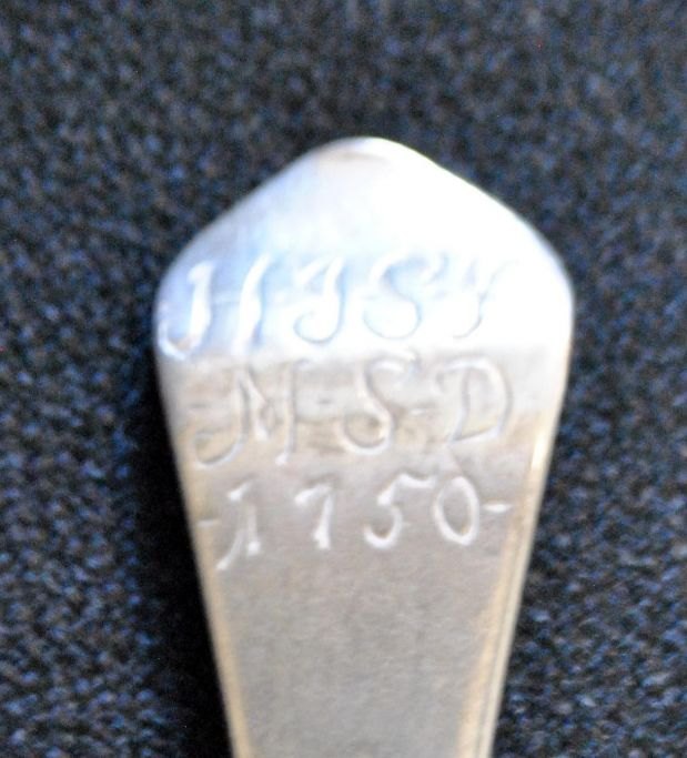 Rococo silver spoon, 1750, probably master Jens Mikkelsen (1723 - ) Aalborg, Denmark. With decorations on the laf, including a rat's tail. Master's stamp. With engraving on the back: HJSK - MSD 1750. L.: 19.5 cm.With signs of wear!