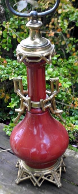 French table lamp, 19th century. Former kerosene lamp, converted to electric. Bronze and body in oxblood-colored porcelain. H.: 65 cm.Item number: 28444