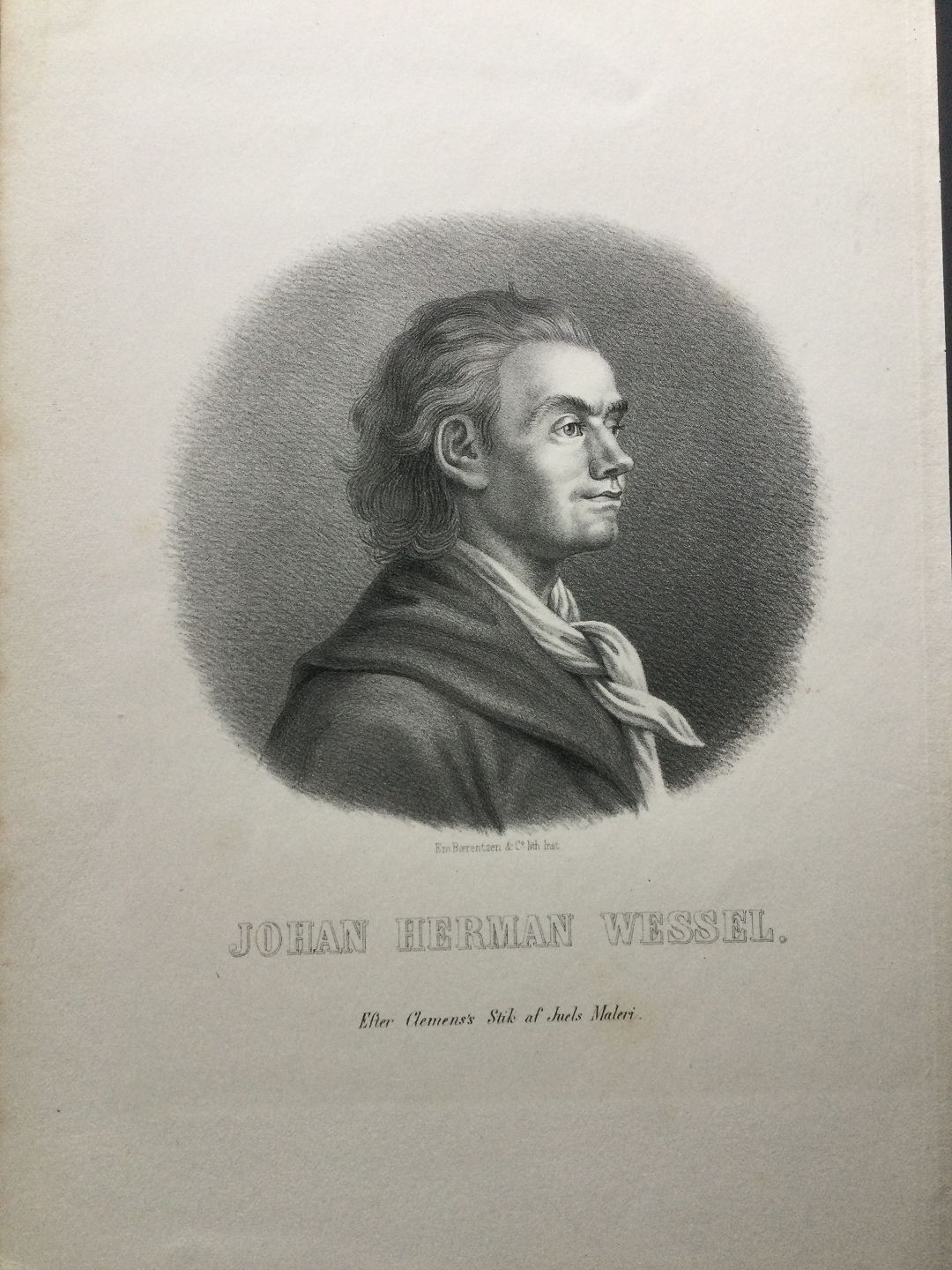 Litografi af Em. Bærentzen - Portræt af Johan Herman Wessel.