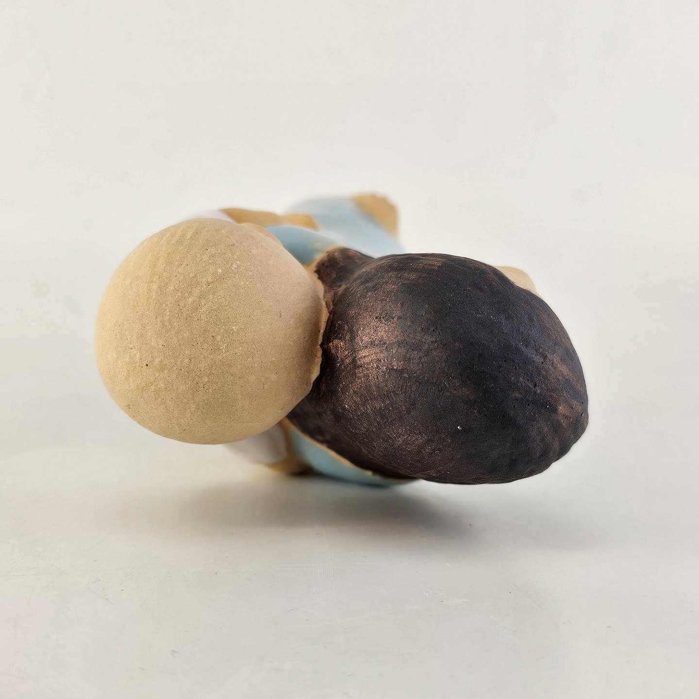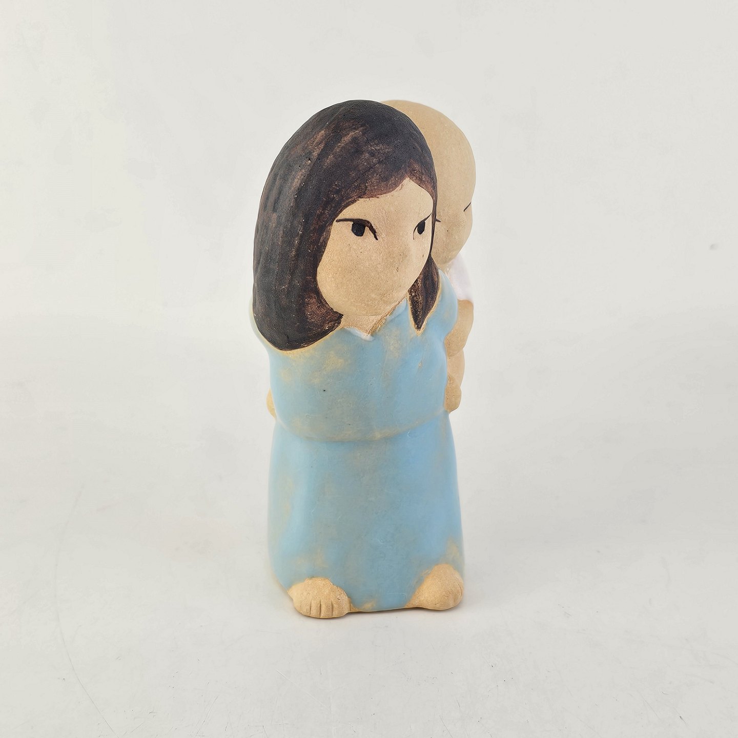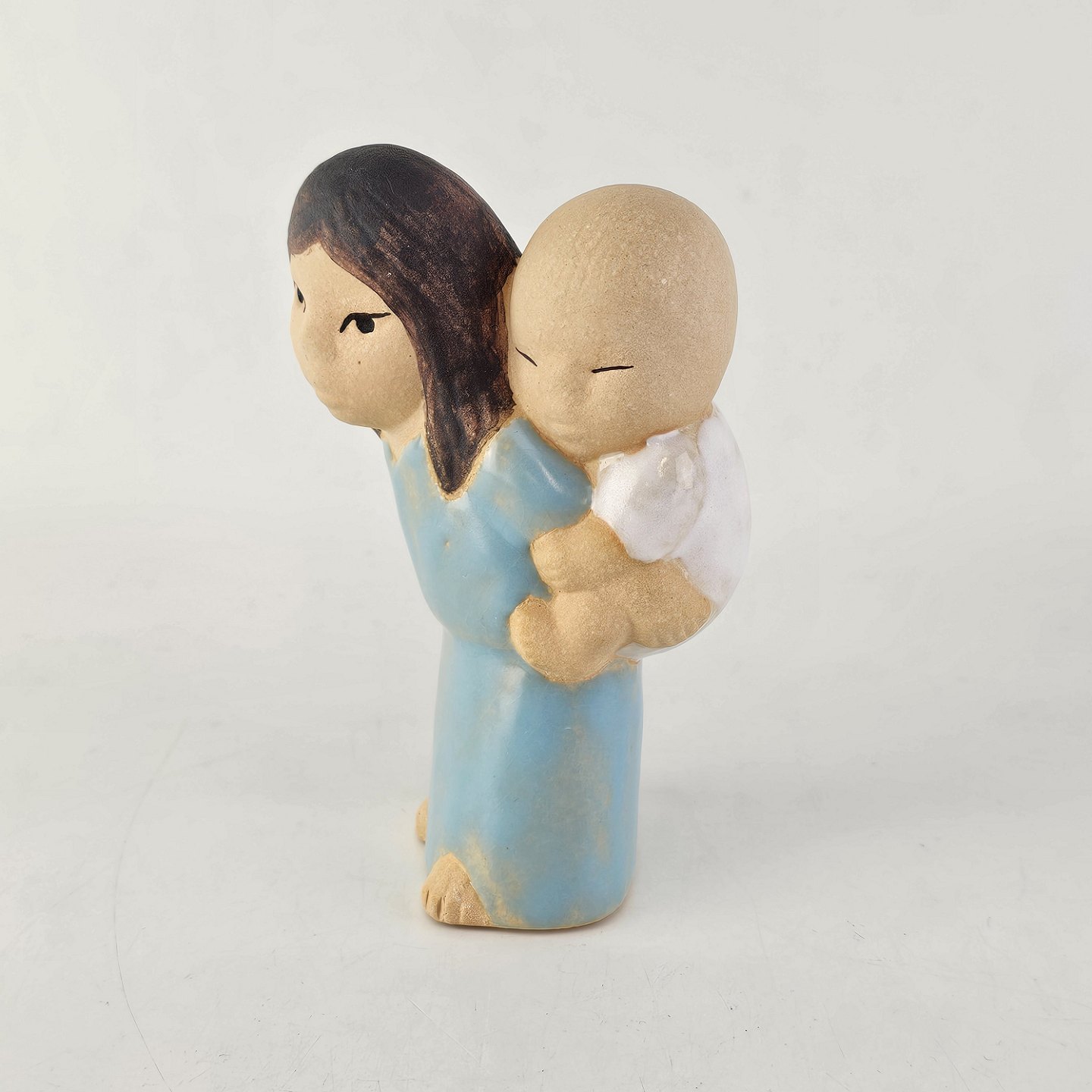 Figur i keramik med motiv af en pige med lys hud og brunt hår, som har et barn på ryggen. Figuren er fra serien Children of the World (All världens barn), designet i 1975