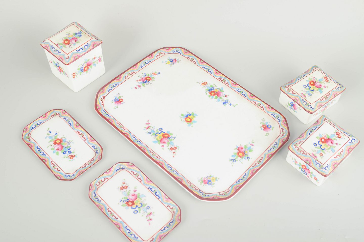 Rectangular tray with four lidded boxes in varying sizes. White porcelain with polychrome floral decoration and a characteristic flowing border in Art Deco / chinoiserie style — commonly referred to as the “Peacock” pattern.