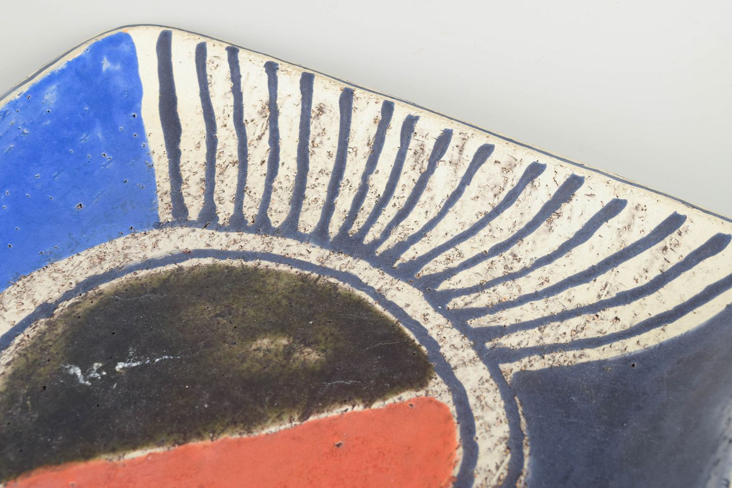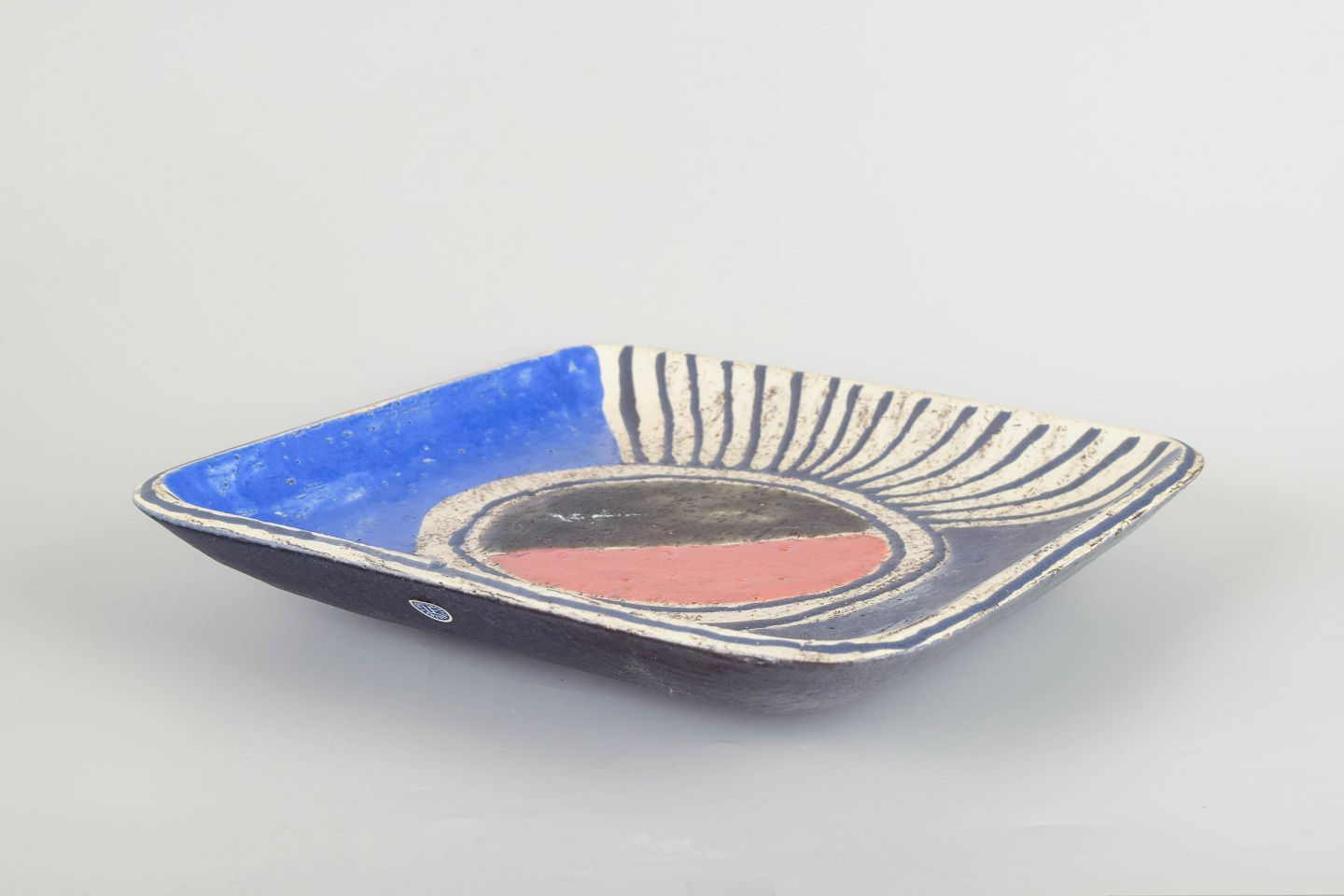 Rectangular stoneware bowl with hand-decorated concrete/geometric motif in blue, black, red and white glaze. Slightly curved edges and shallow cuvette form.