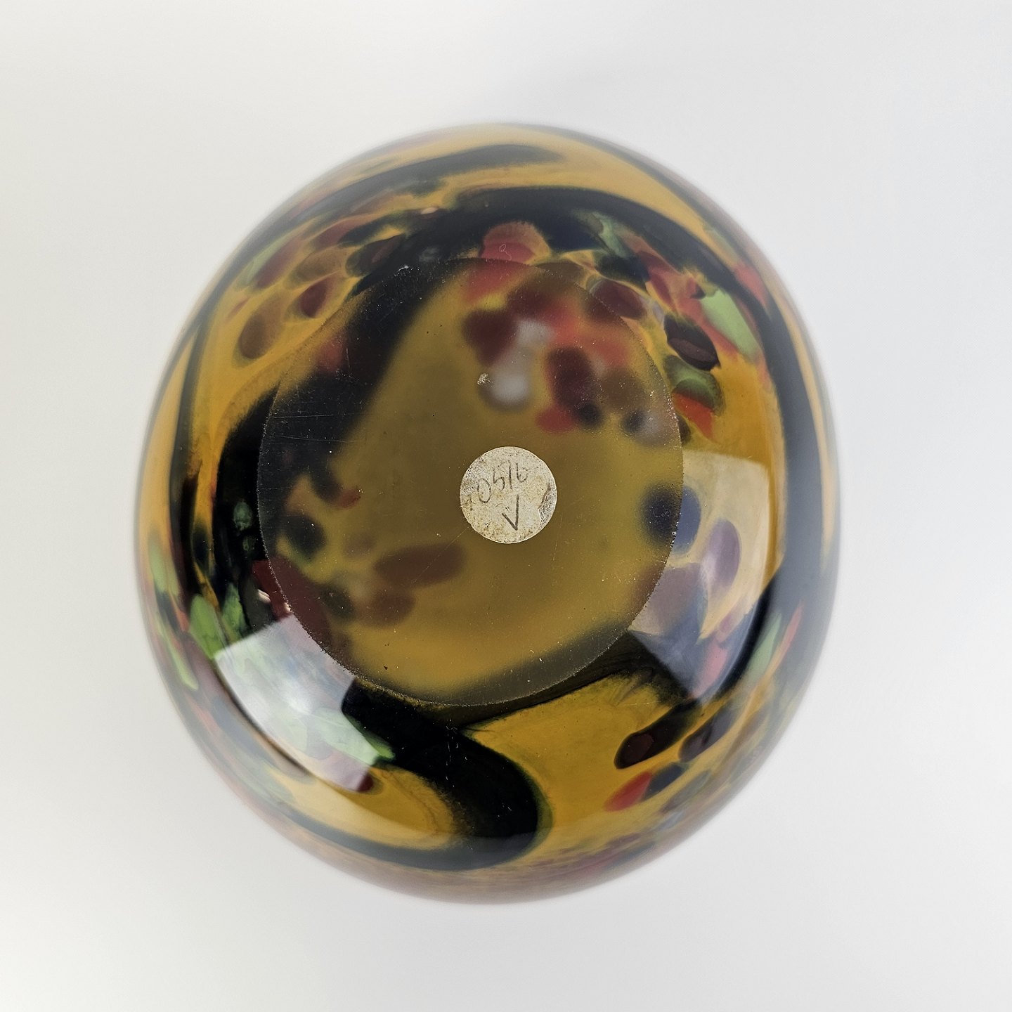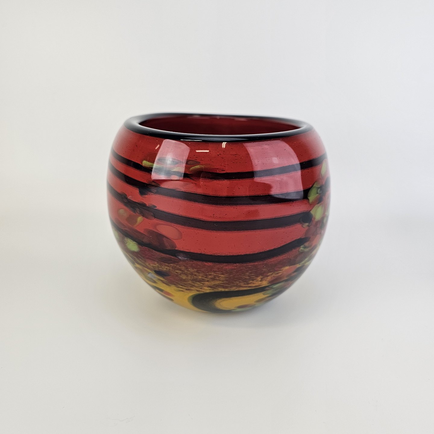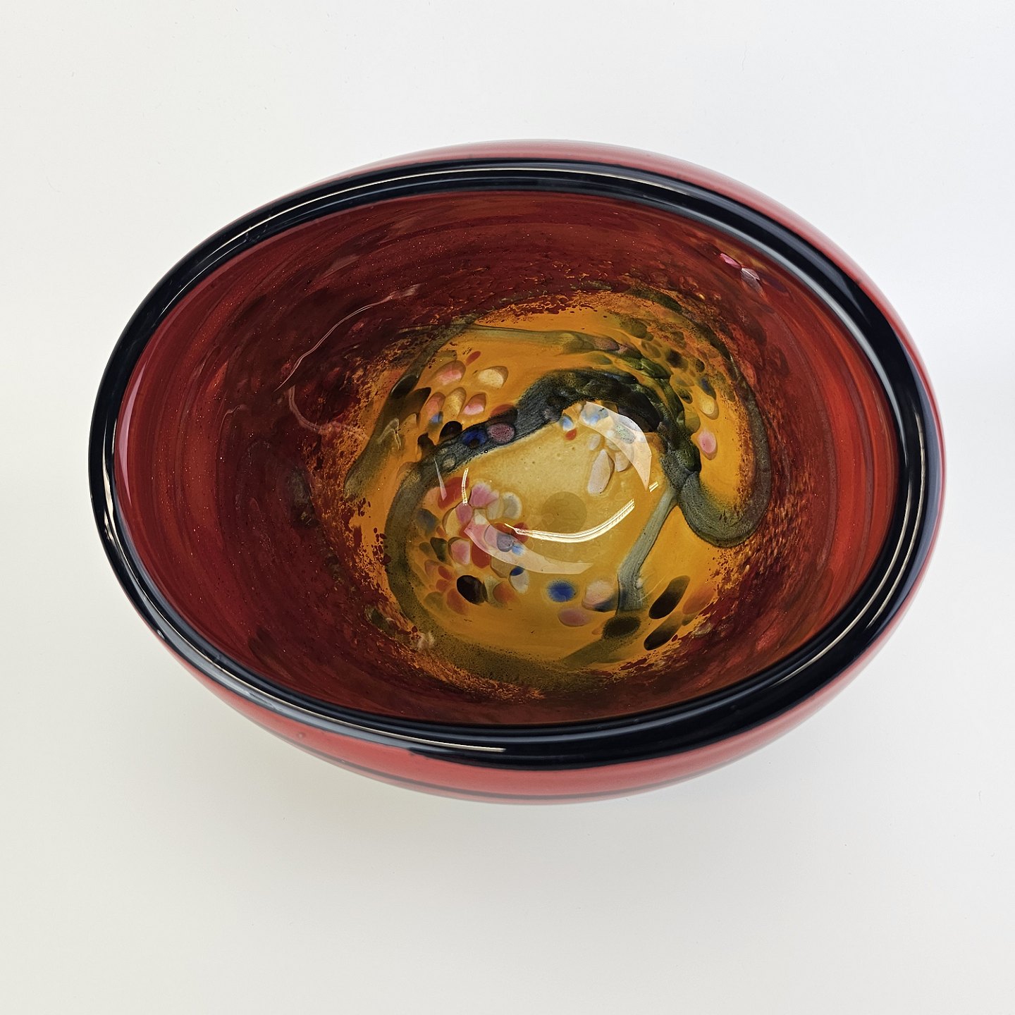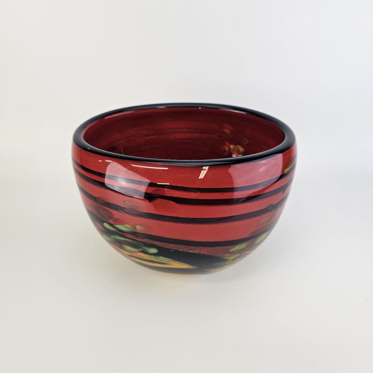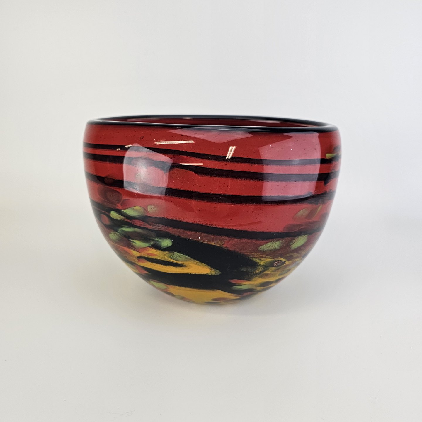 Unika skål i glas med abstrakt mønster i røde, sorte, gule og grønne nuancerFormgiver Ioan Nemtoi