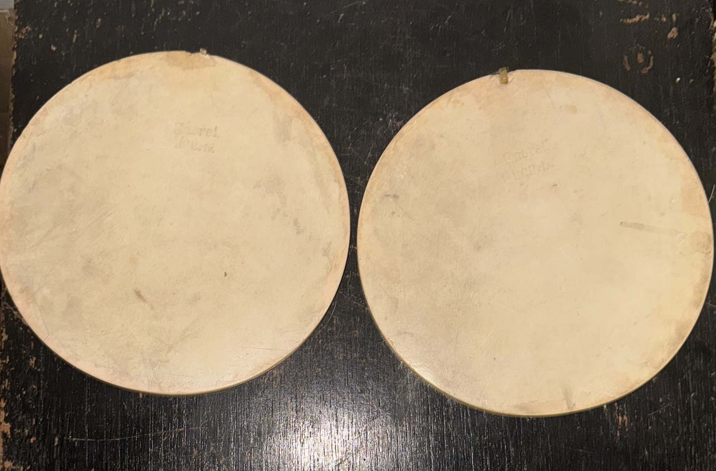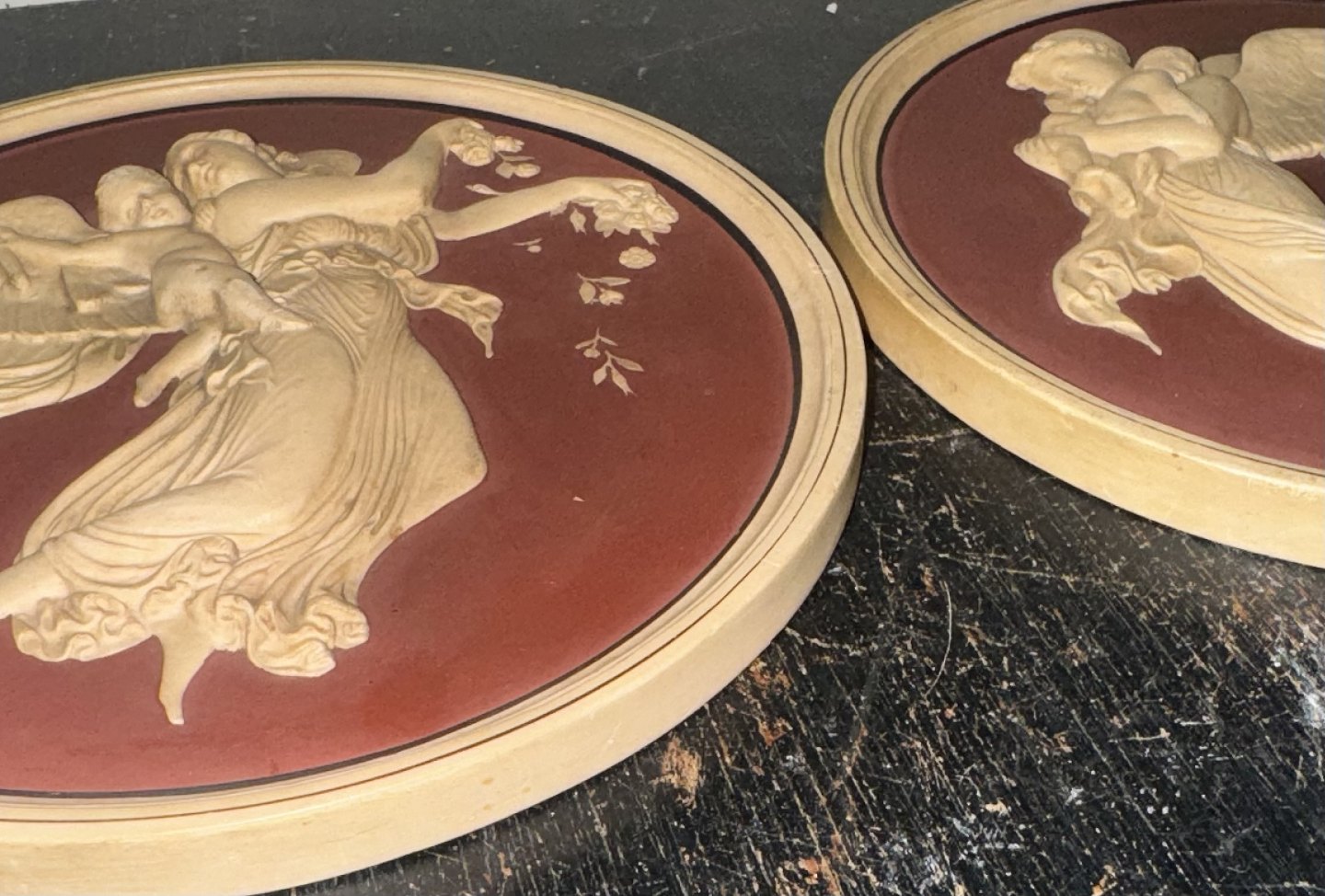 Pair of plates with motif of Bertel Thoevaldsen's “Night & Day” in relief. Made in plaster at the workshop of Hans Christian Brix (1831-1907) in the late 19th century. To emphasize the relief, the base is painted Burgundy. The plate appears in good condition with a few traces of use on the back, where the manufacturer's name is stamped - H. C. Brix. Diameter 18.3 cm Dealer