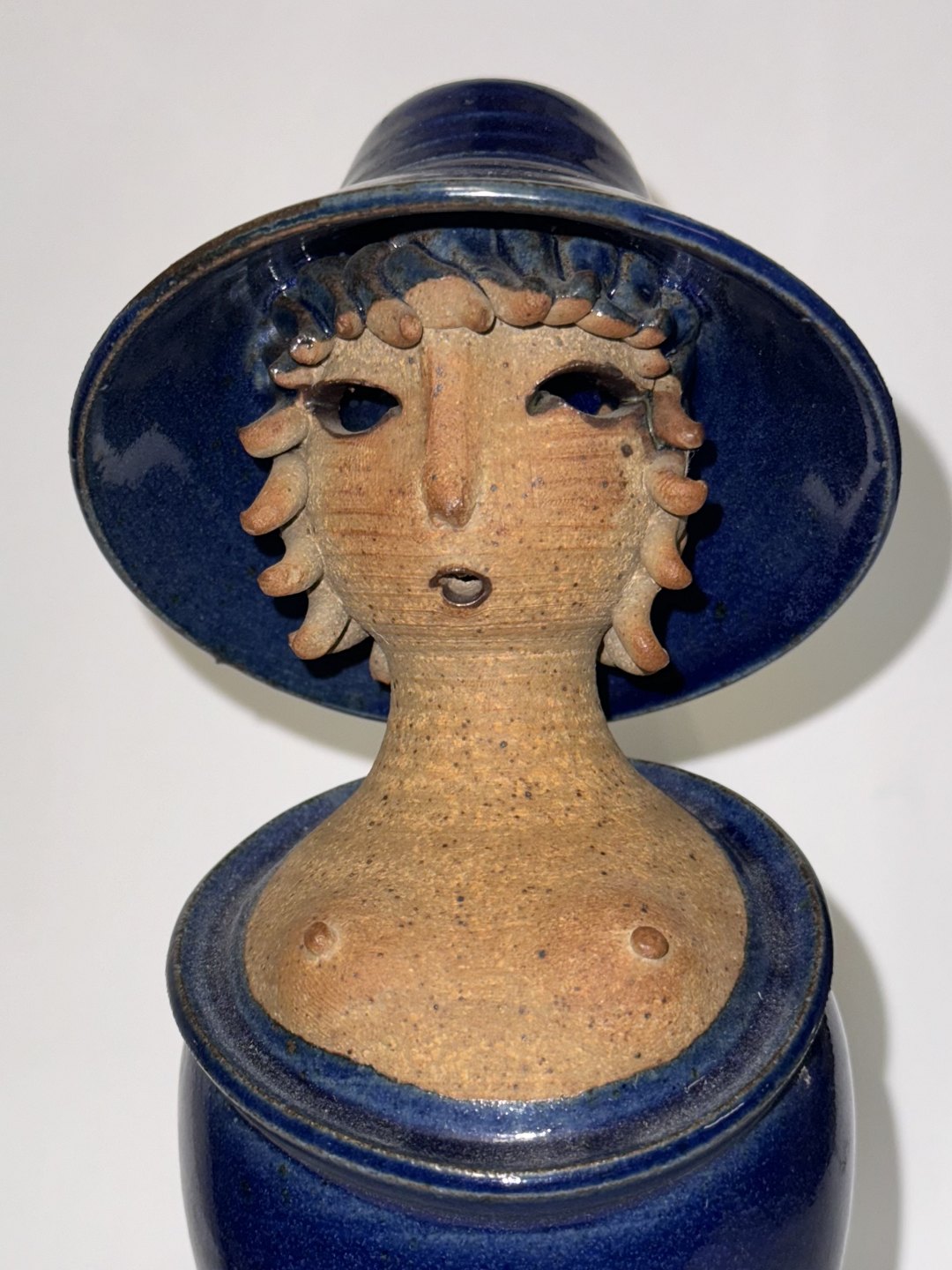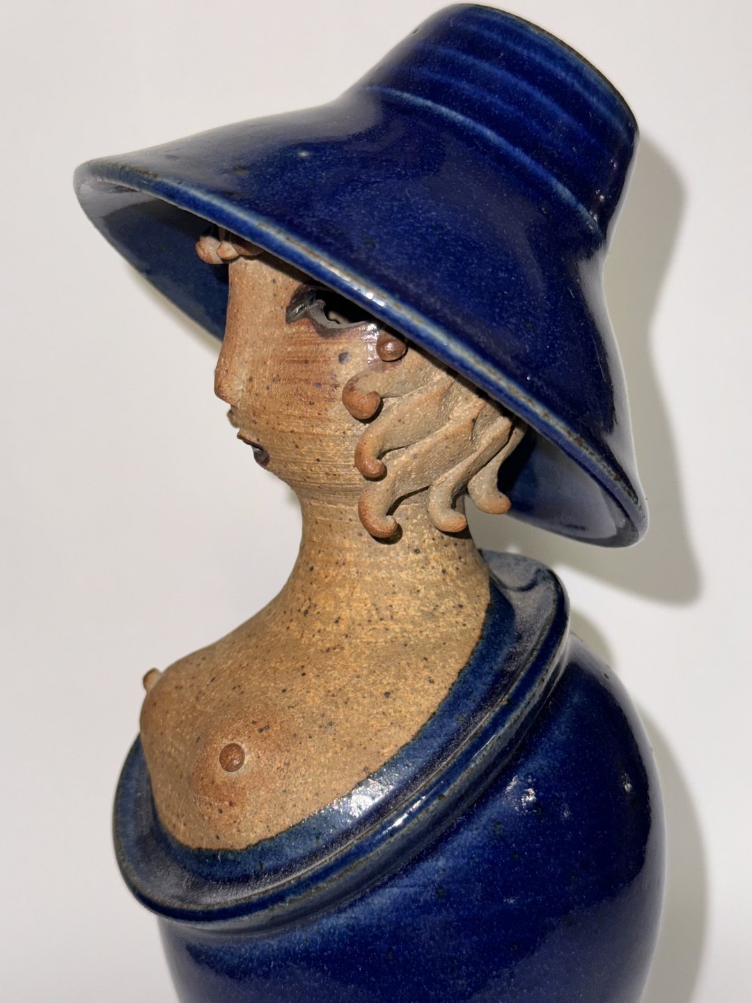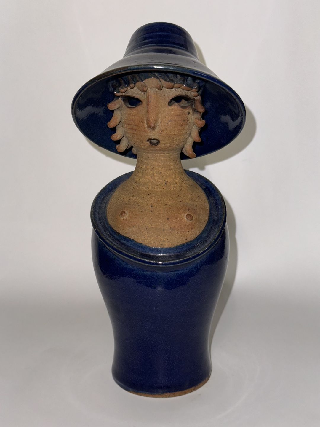 Ceramic figure of a woman with a hat. Appears in good condition without damage. Designed by Jacob Bang, who created several similar figures in different poses. This version with blue glaze. Hole in the back for flowers, for example. Stamped on the bottom with the artist's name and model number 14 and DANMARK. H. 21 cm Dealer