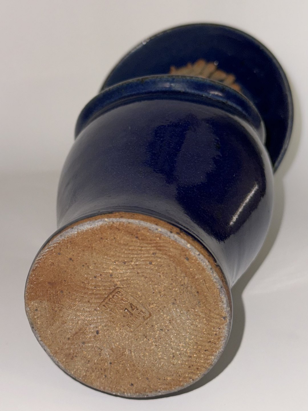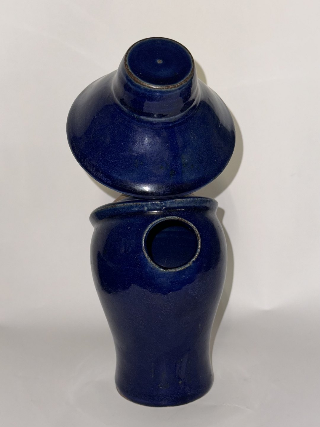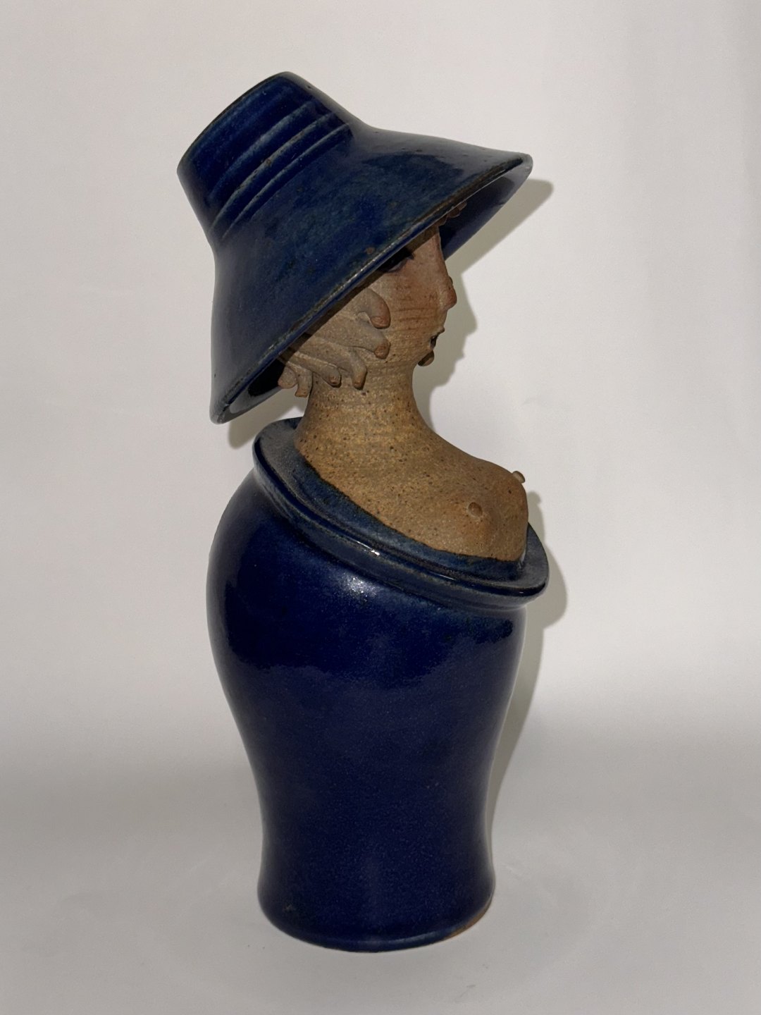 Ceramic figure of a woman with a hat. Appears in good condition without damage. Designed by Jacob Bang, who created several similar figures in different poses. This version with blue glaze. Hole in the back for flowers, for example. Stamped on the bottom with the artist's name and model number 14 and DANMARK. H. 21 cm Dealer