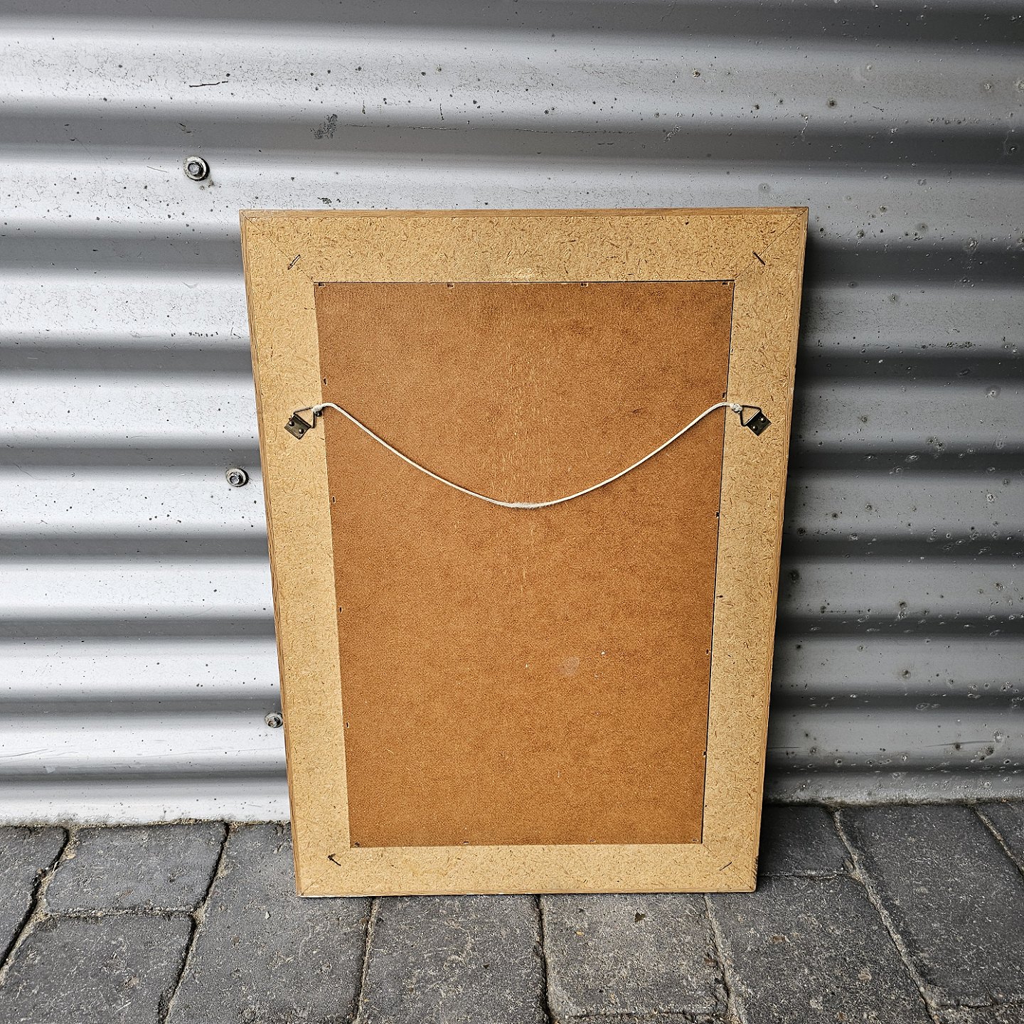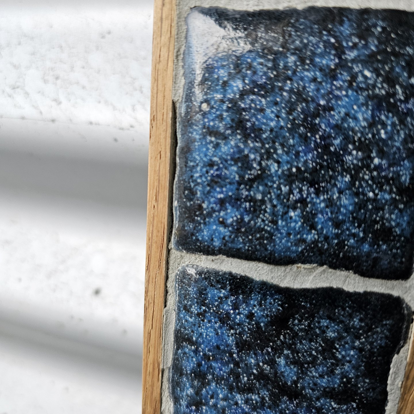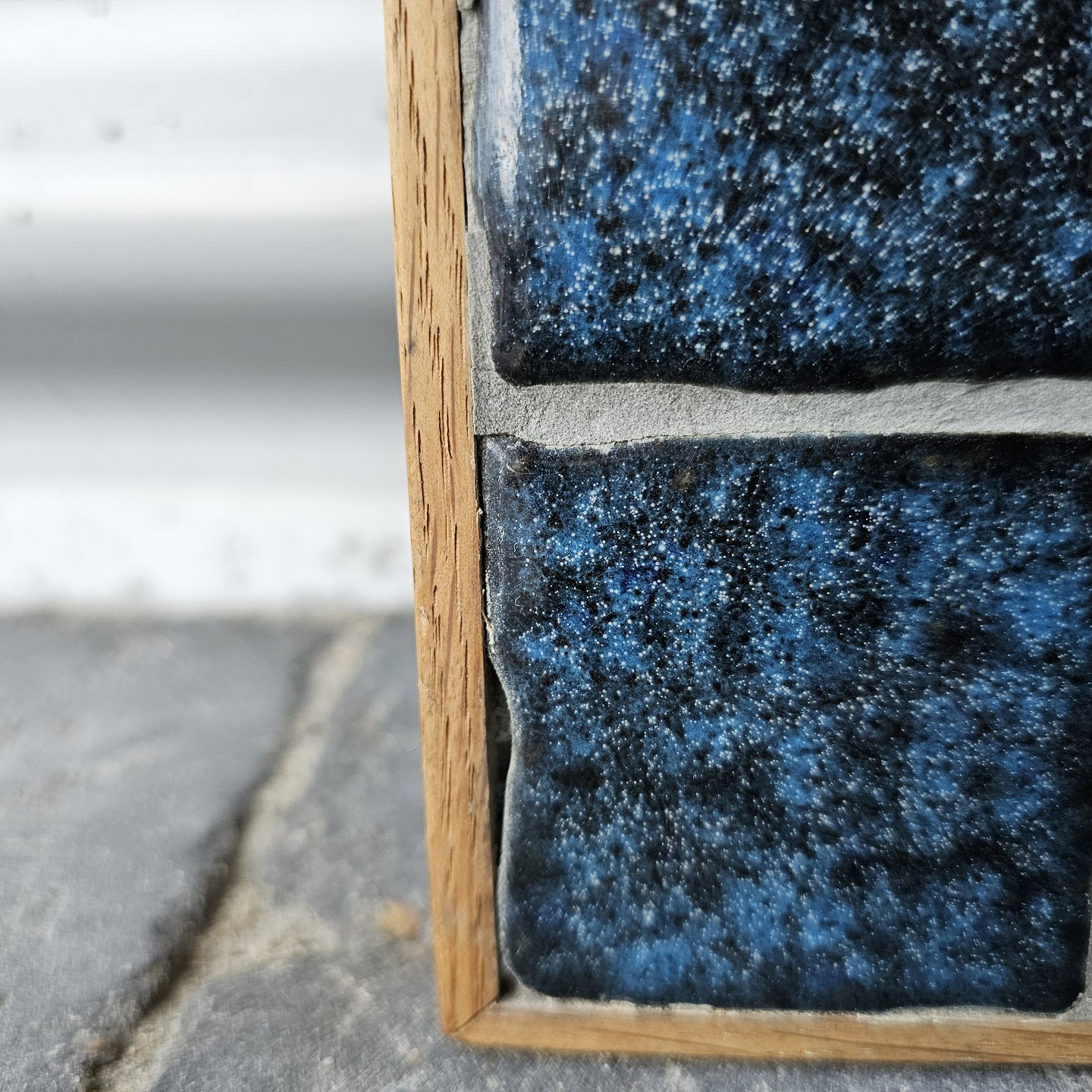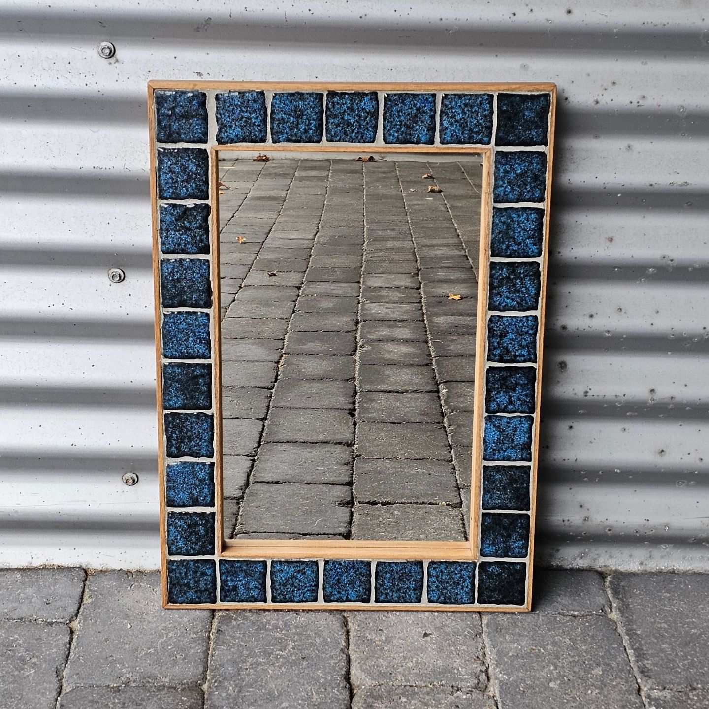 Rektangulært spejl med ramme dekoreret med blå klinkerDer er fejl i to klinker, men ingen afslag