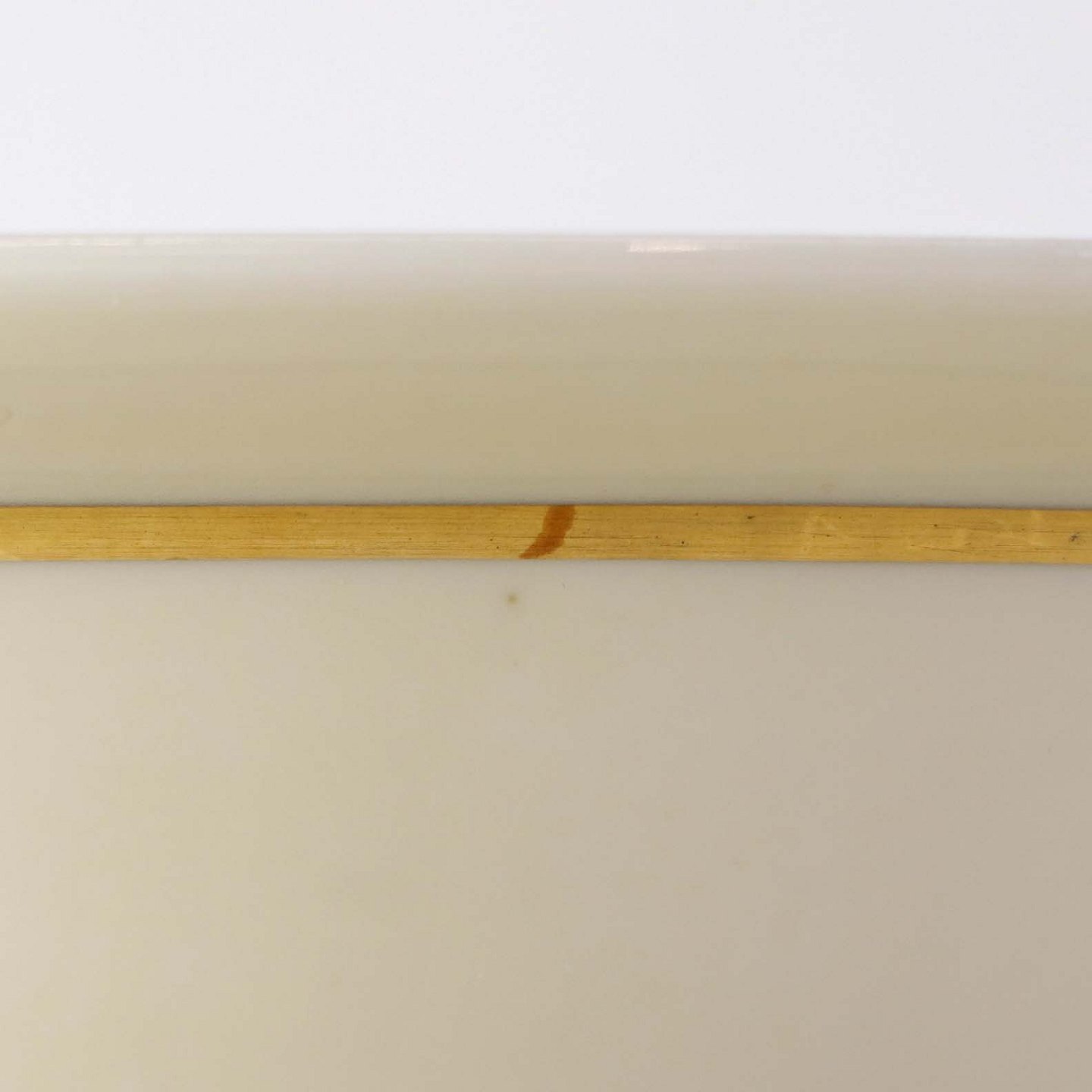 Fremstår med mindre ujævnhed et stedet i porcelænet samt uens glasurfarve ved kant, mindre brugsspor under bund og på guldkanten.