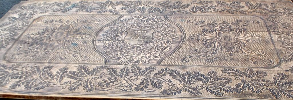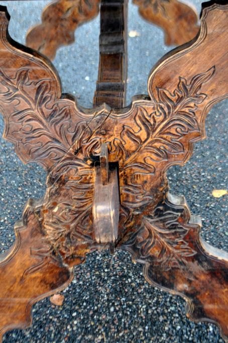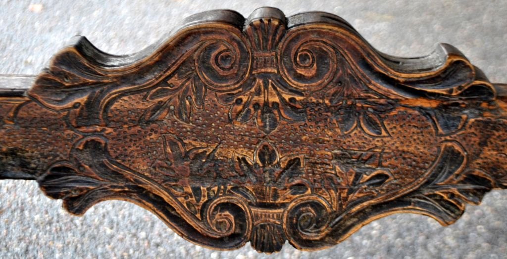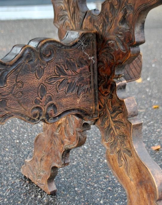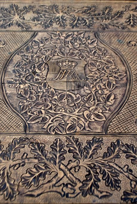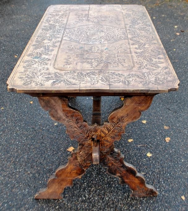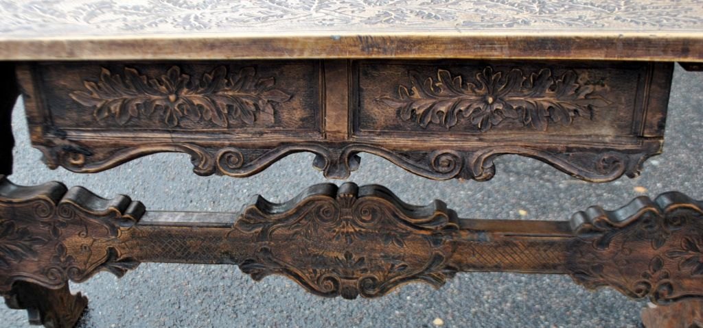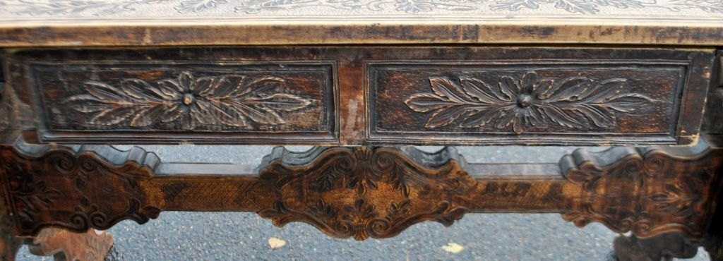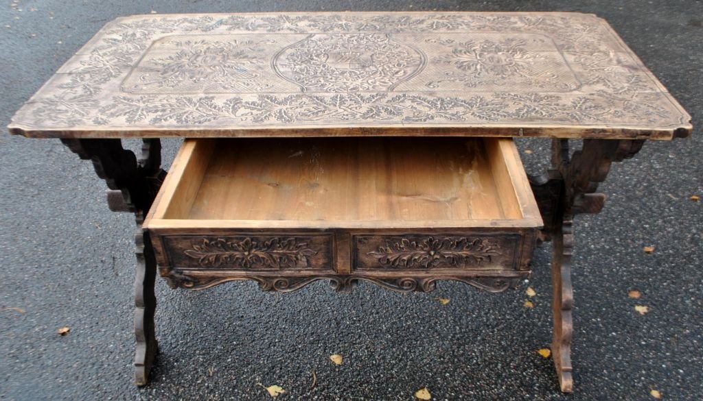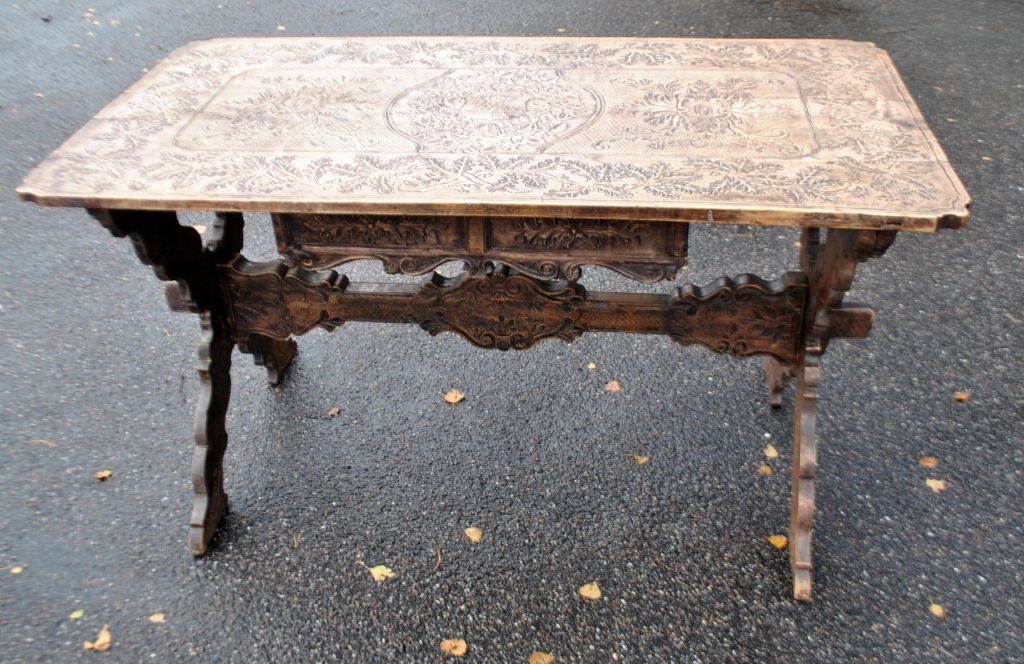 Antique long table with carvings and drawer, 19th century. Countless carvings on top, drawer, legs and base. In the middle, a carving of a ducal crown. Probably Germany. L.: 141 cm. W.: 73 cm. D.: 77 cm.Item number: 28454