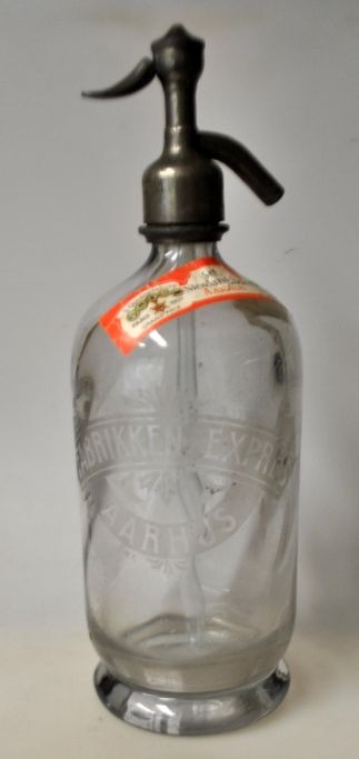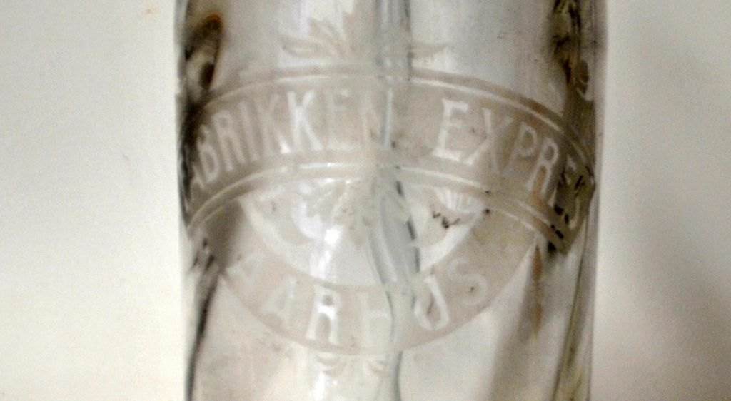 Chiffon bottle, Aarhus, Fabrikken Expres, 19th century Denmark. Clear glass with etchings. H.: 30 cm. With attached ribbon from Sct. Nicolauskilde.Perfect condition!