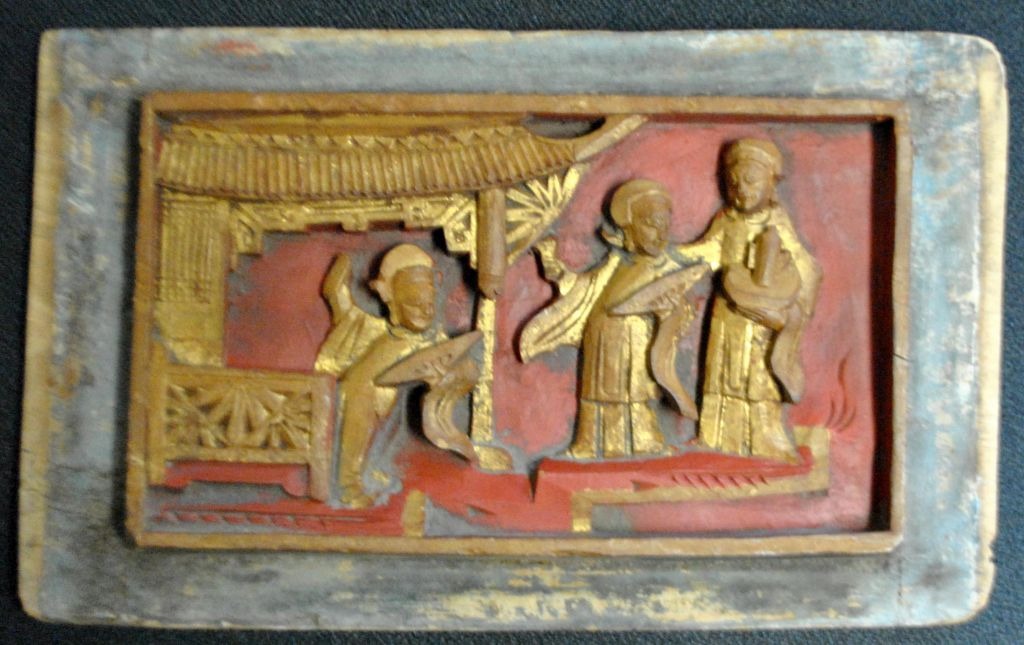 Antique Chinese painted woodcut, 19th century. With scenery of women in a building. 15 x 24 cm.Item number: 28465