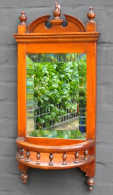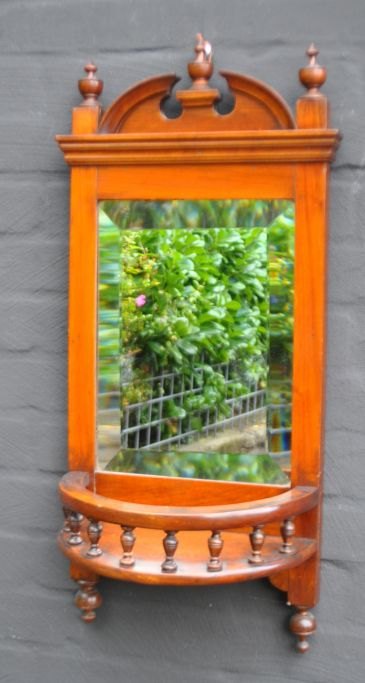 English wall mirror in mahogany with shelf, 19th century. Semi-circular shelf with turned columns. Top with turned knobs. With faceted mirror. H; 65 cm. W.: 28 cm.Great condition!