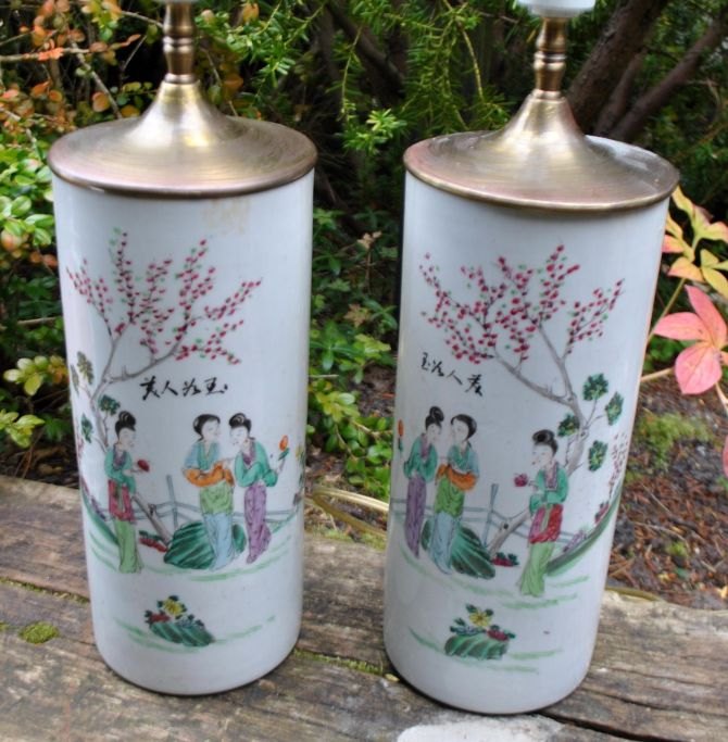 Pair of Chinese porcelain hat stands, 19th century. Converted into table lamps. Hand-painted polychrome decorations of a woman in a garden. With text in Chinese. H.: 29 cm. Height with electrical installation: 53 cm.Sold as a pair only!