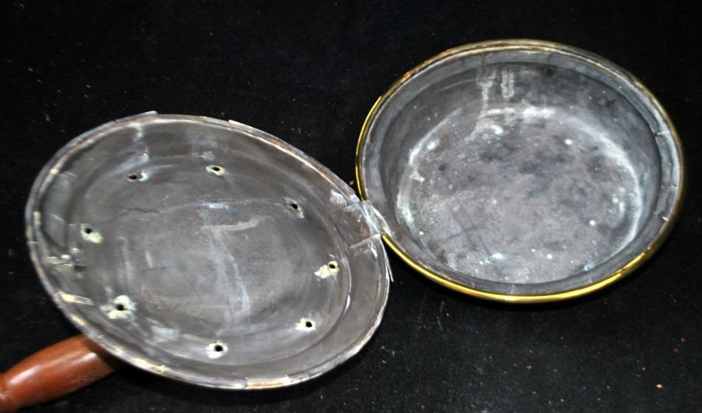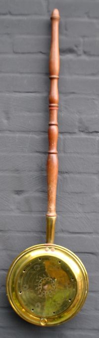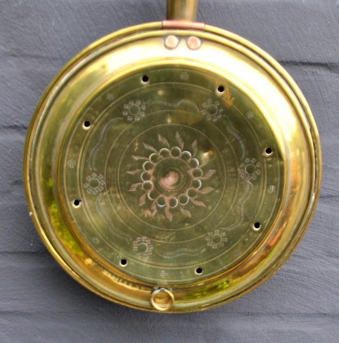 Danish heating basin in brass, 18th century. Lid with floral decorations. Oak handle. L.: 106 cm. Neck diameter: 27 cm.Great condition!