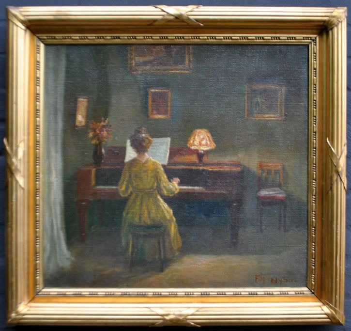 Friis Nybo, Poul (1869 - 1929) Denmark: Woman playing piano. Oil on canvas. Signed. 49 x 52 cm.Framed: 61 x 65 cm.