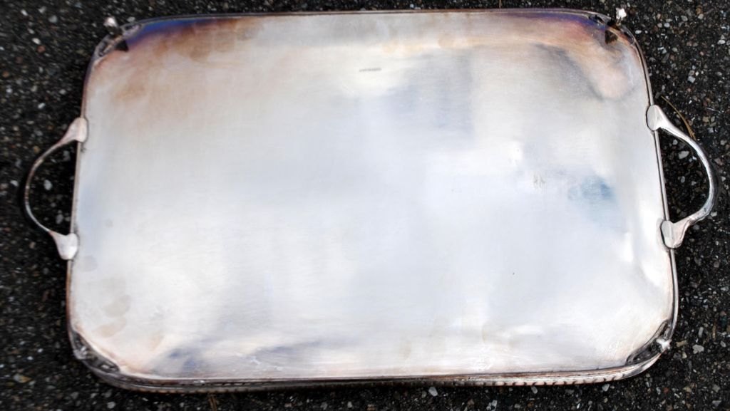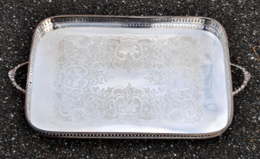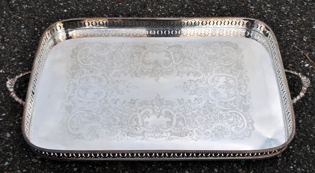 Large English silver-plated serving tray, 20th century. With openwork edge and two handles. Base with rococo decorations. On four claw & ball. Stamped: Silver on cupper. 46.5 x 31 cm.Item number: 28339