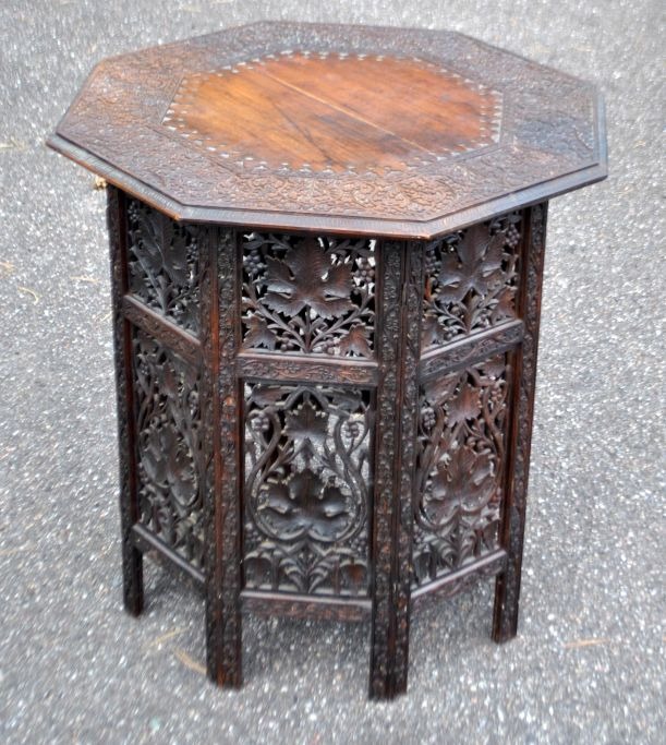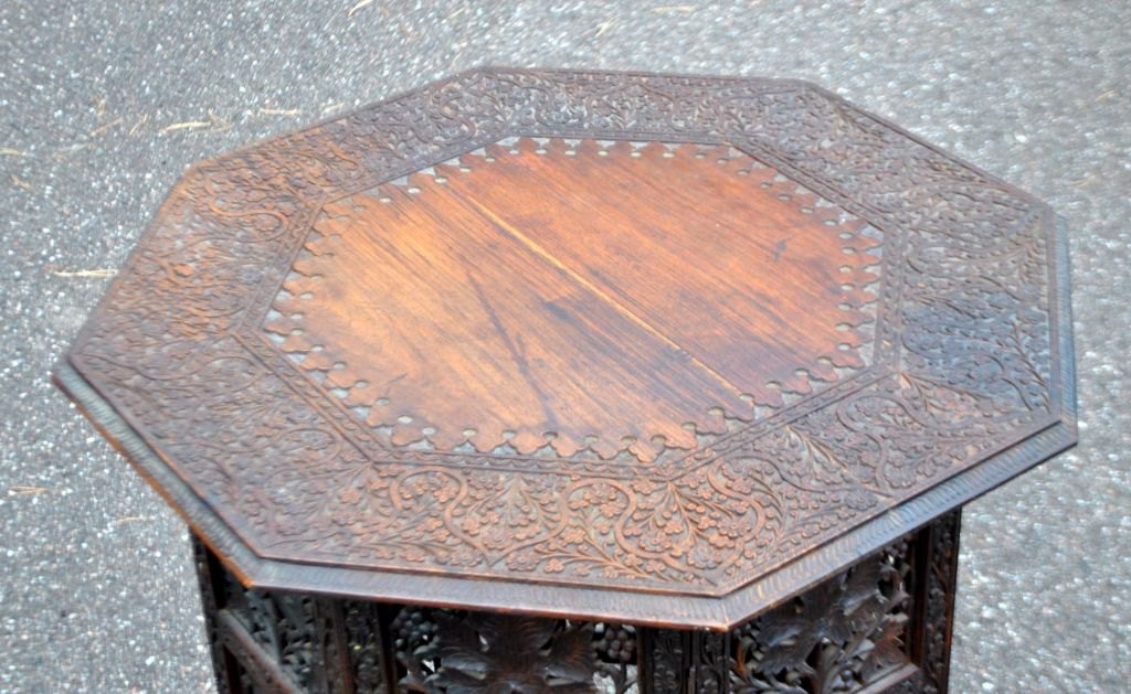 Arabic octagonal smoking table with numerous carvings, 19th century. Stained wood. H.: 64 cm. W.: 60 cm.Item number: 28340