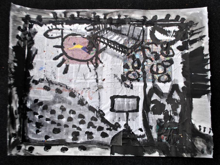 Kühl, Lena (1950 -) Denmark: Composition, 2024. Collage with newspaper clippings and marker pen. Signed: Lena Kühl 2024. H: 56 cm. W: 76 cm.Unframed.