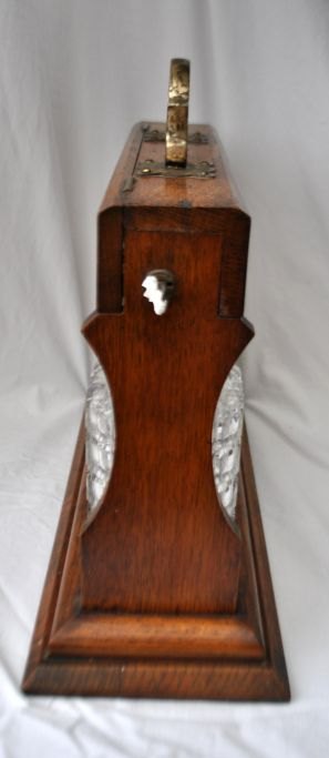 English tantalus with three crystal decanters, 19th century. Oak. With brass fittings and lock with key. H: 33 cm. L: 37 cm.Item number: 28482
