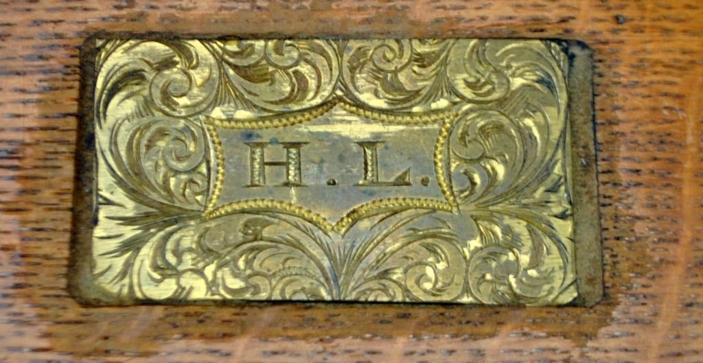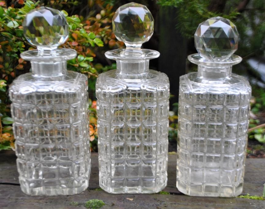 English tantalus with three crystal decanters, 19th century. Polished oak box with lock and key plate. Containing three decanters with stopper. Stamped. H: 27 cm. L: 30 cm.Item number: 28485