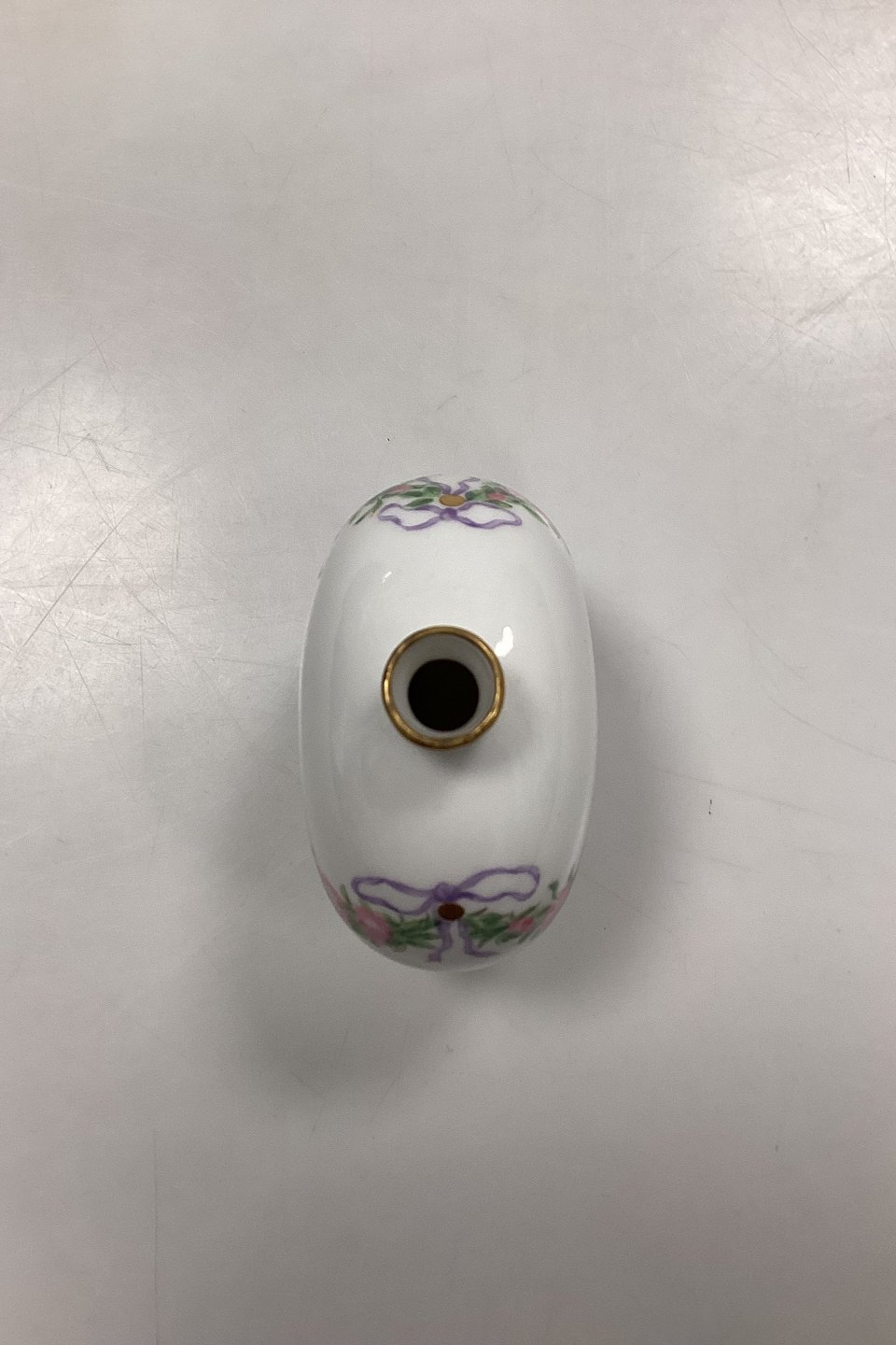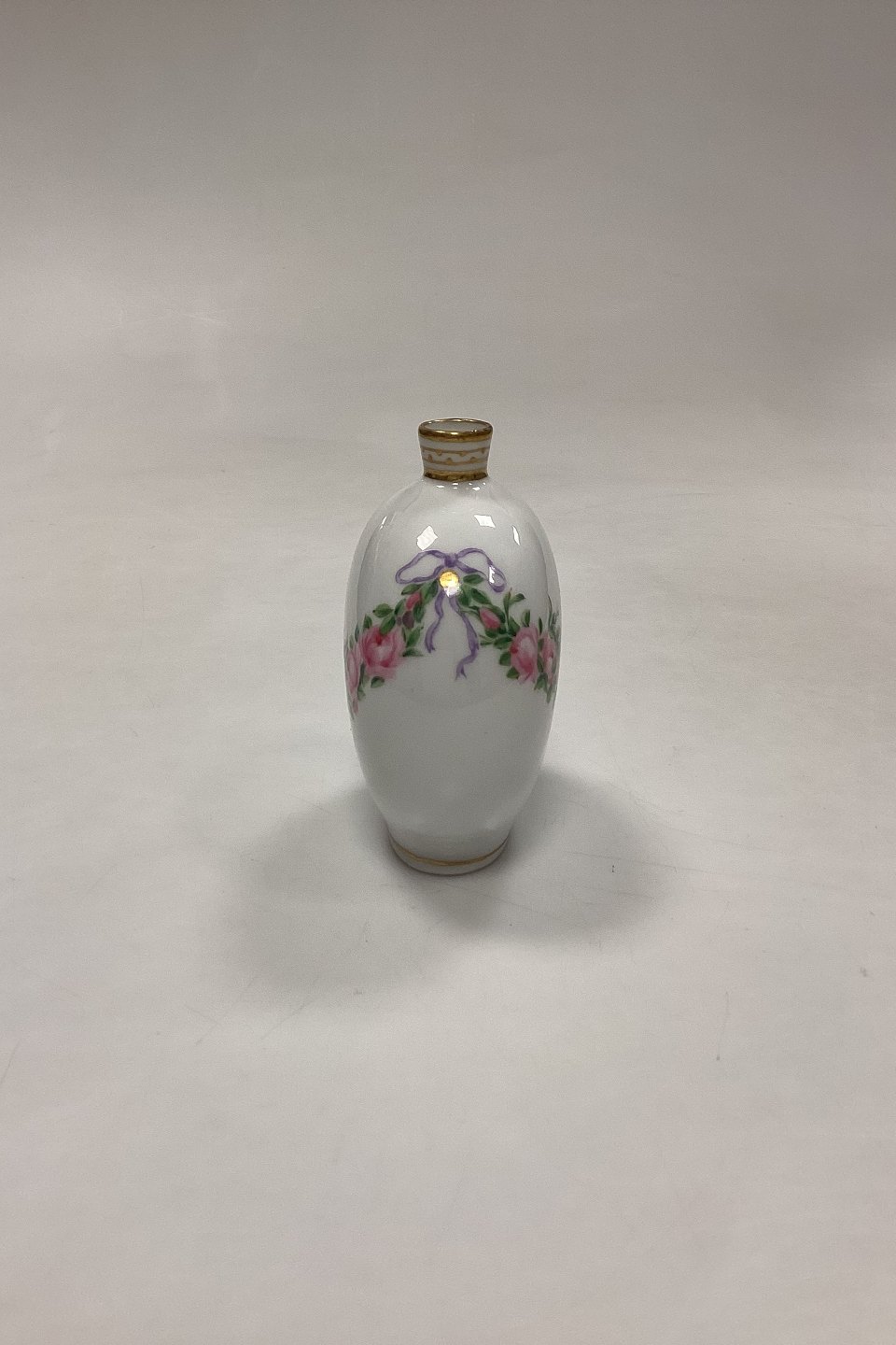 Royal Copenhagen Privately Painted Vase. Motif with pink rose garland. Inscription at the bottom: Christmas Eve 1906, GS. Measures 10 cm / 3.93 in.Stock: 1