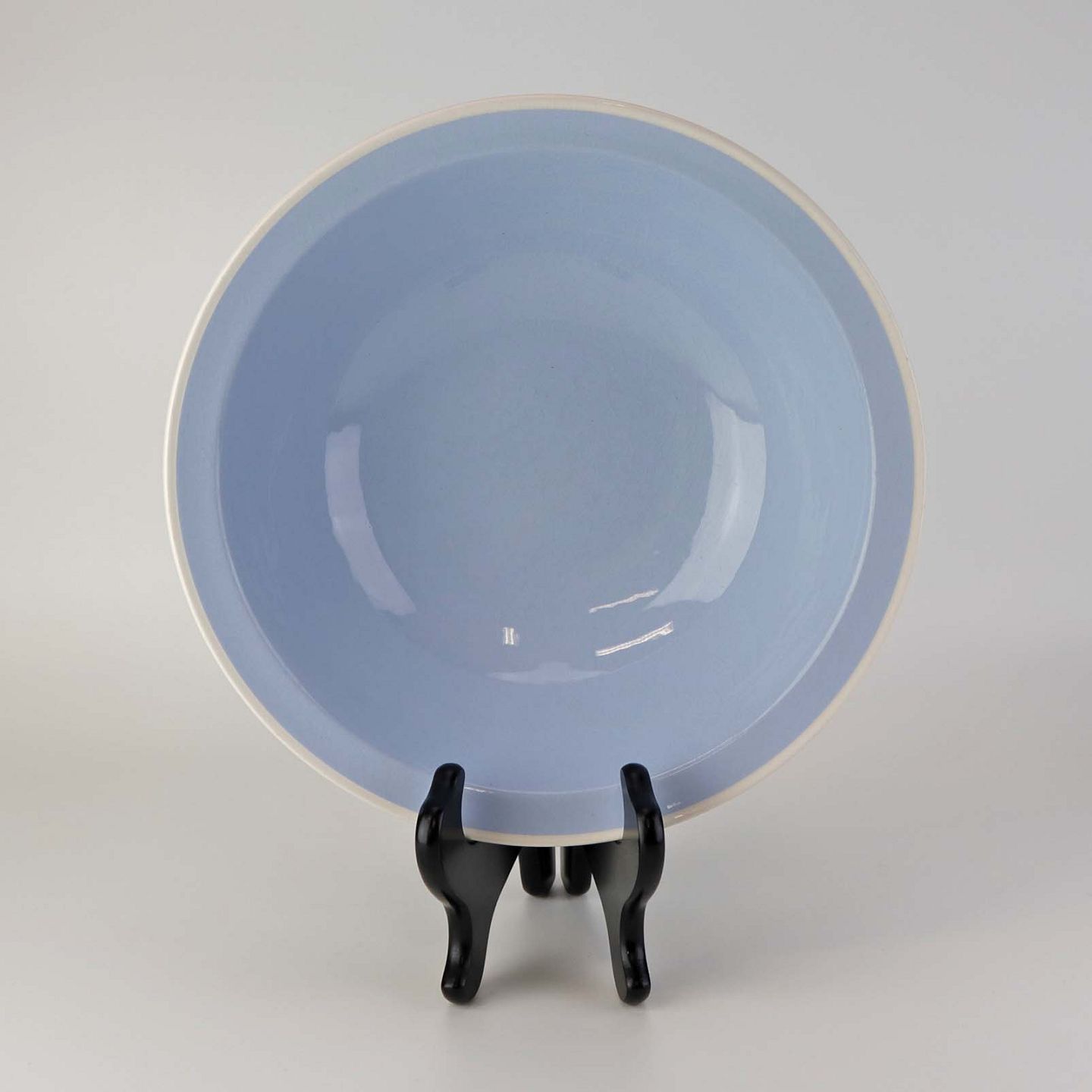 Service i lyseblå fajance dekoreret med tynd hvid kant.