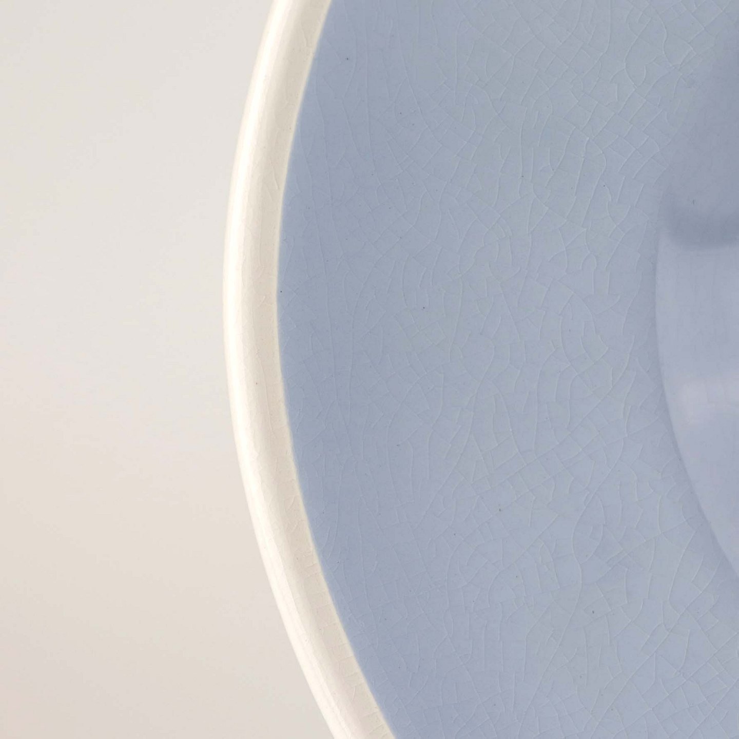 Service i lyseblå fajance dekoreret med tynd hvid kant.