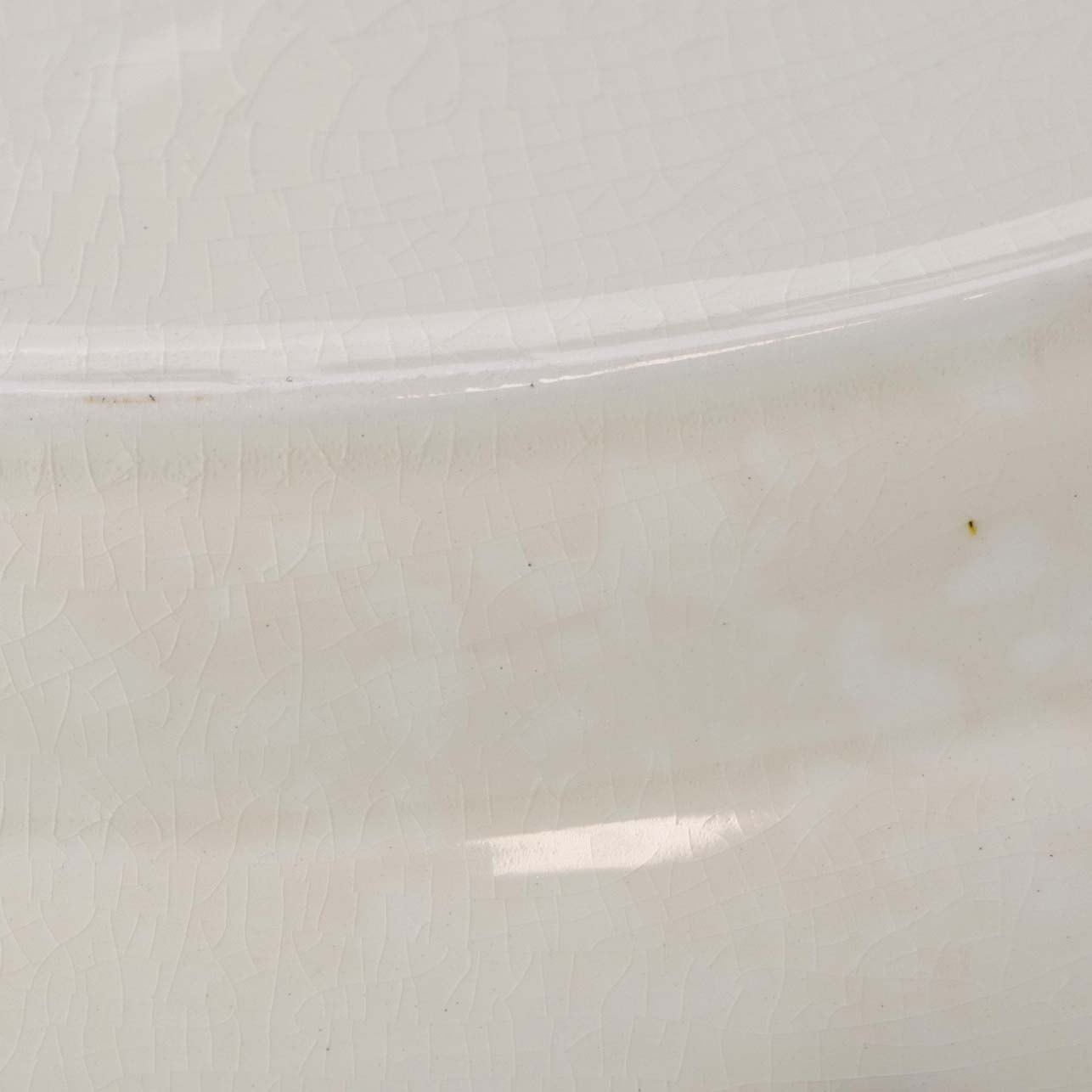 Fremstår med krakkeleringer i glasuren, uensartedhed i den hvide farve på bagsiden samt mindre brun plet.